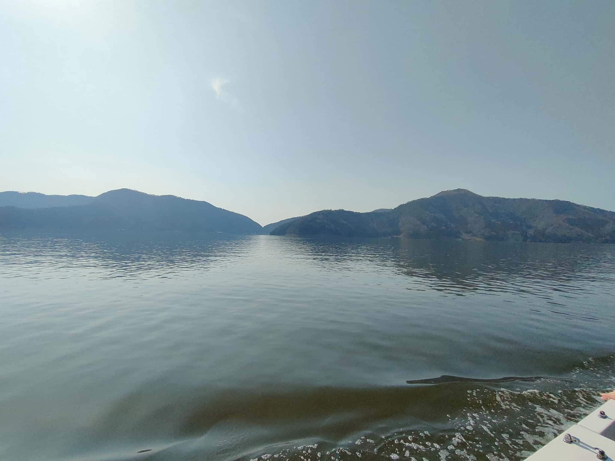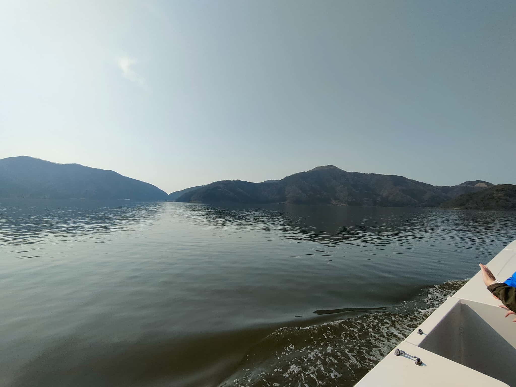 水月湖までくると、デッキに出て外を見ることができます。デッキに出てしばらく船を走らせますので、すごく気持ちがいいです。