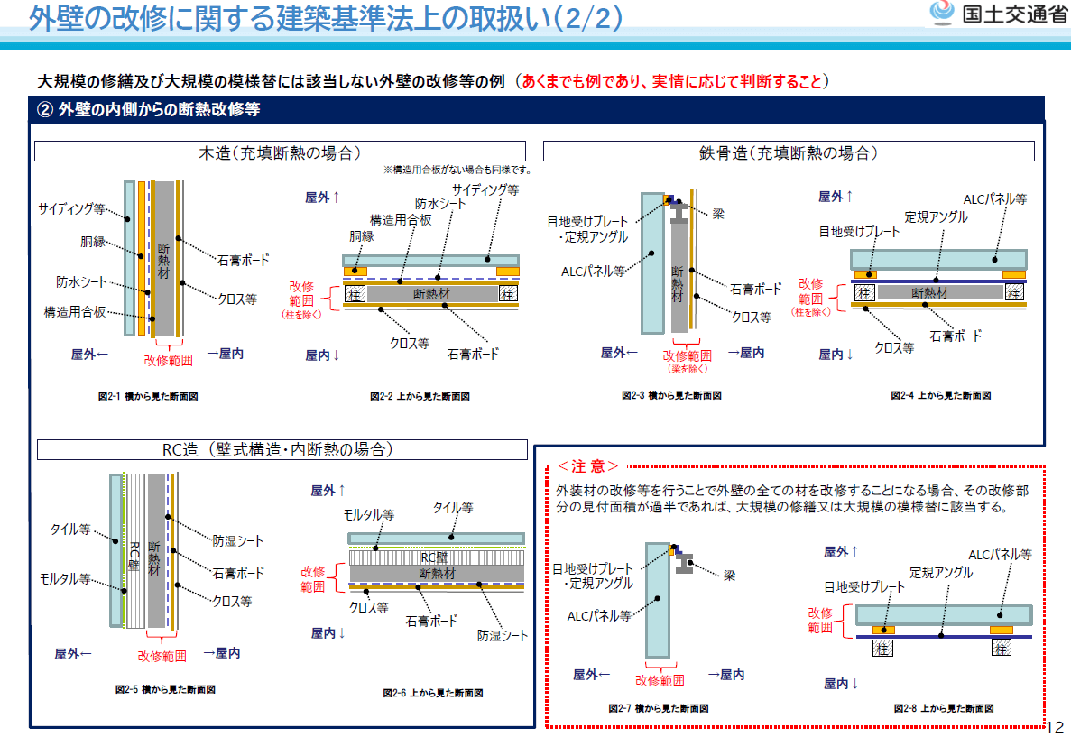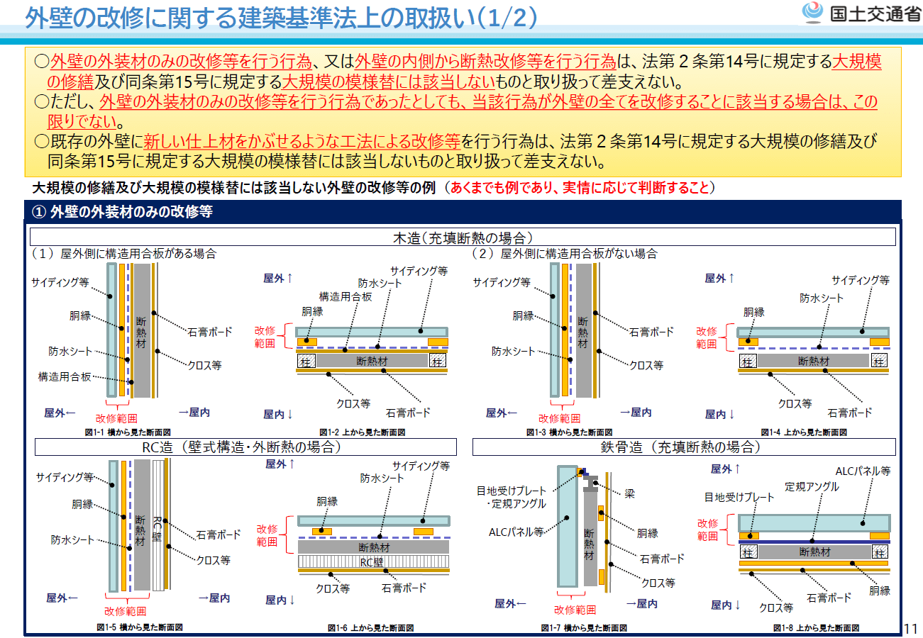 画像はその資料の中の、「外壁の改修」に関する取扱い事例の説明なのですが、耐震ではなく、断熱改修の場合の壁の改修事例での説明です。