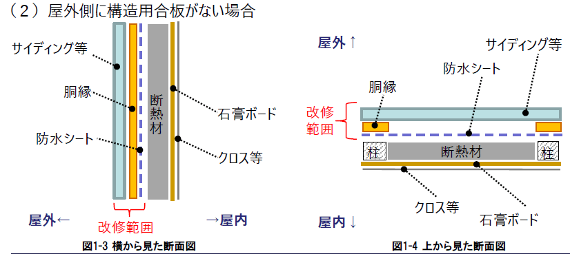 実は、このイメージがそのまま判断材料になるのは、断熱を入れるための改修を、そのまま「筋交い設置」や「構造用面材」設置として読み替えますと、この図がそのまま判断材料として使えるというわけです。条件があります。図にも示されていますが、壁の改修範囲はあくまでも「柱を除く」、柱間での施工なわけです。図では断熱材となっていますが、これがそのまま「筋交い」に置き換わったても、同じ判断でOKなわけです。