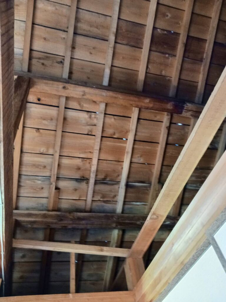 また、細部にわたって調査しますと、軒先に積雪による「たわみ」があり、一部、破損もございました。使われていた屋根垂木は一般的に福井で使われている材よりも細く、かつ、その間隔も少々粗い感じです。というわけで、緊急で屋根改修を行うことになりました。