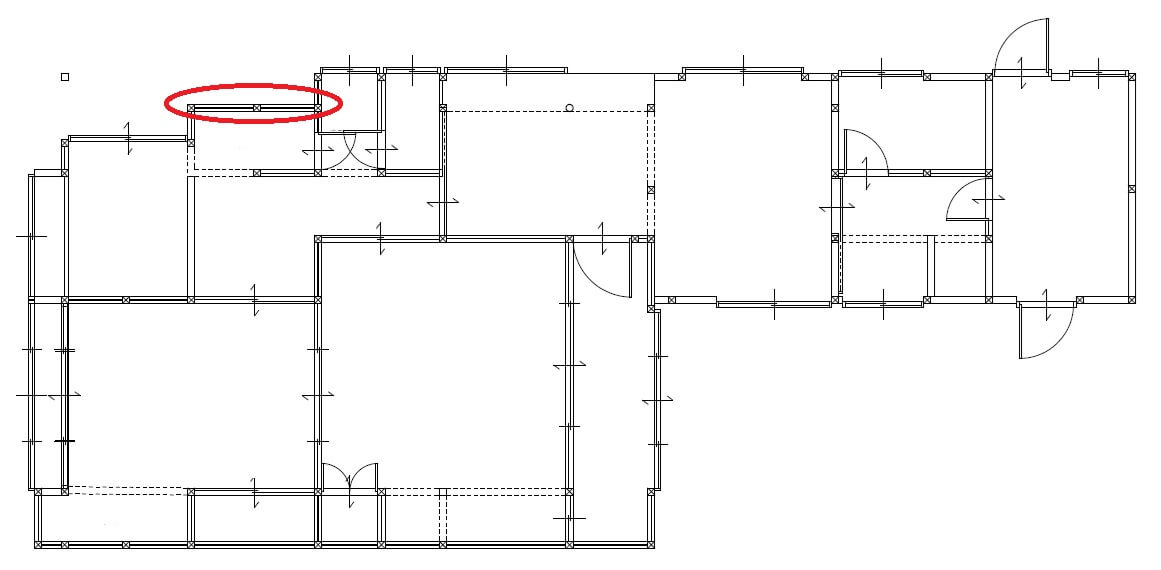 上の外壁ラインと、左の外壁ライン合わせても、この赤の楕円の丸の部分にしか存在していないというわけです。こういった場合に、でっかい出窓風の壁だけを見て、壁のような部分に耐力壁を増強していくということをやったとしても、全く耐震性に寄与するわけがないのです。さらに、厄介なのは、2階の増築が、この出窓風の壁の上になされているというわけです。