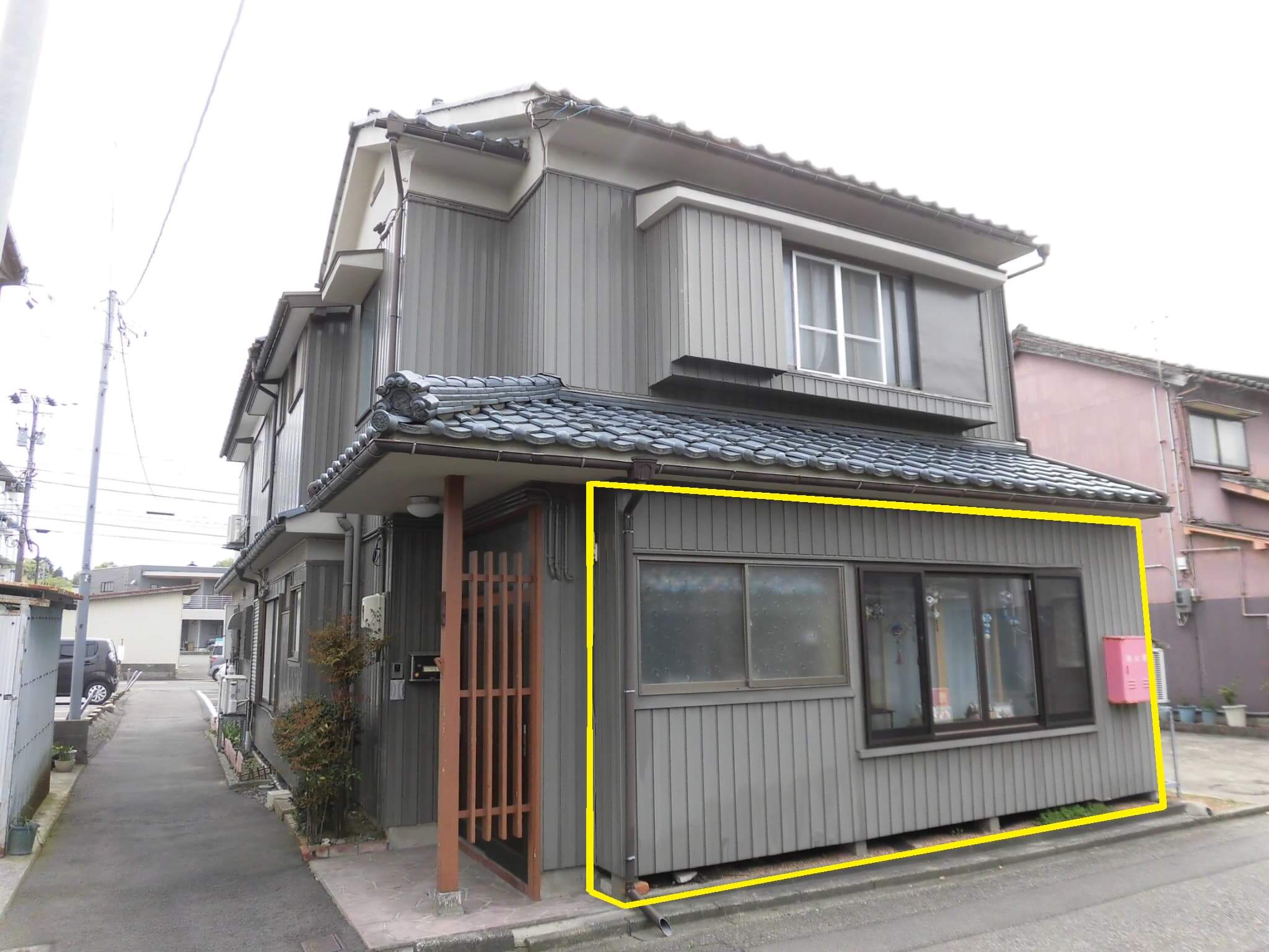 まず、赤の線です。もう、この屋根を見た段階で、この家に何があったのか?がわかりますw それを解説しますと、元々この家のこの画像部分は「平屋」だったのですw 青の線が元の屋根の形状だと思いますw そこに手狭になったということで2階を増築したという流れです。まぁ、ここまではよくある話しですので、「やっぱそうするよね?w」っていうレベルの話しです。問題なのは、黄色の部分です。この部分の基礎がどうなってるか?といいますと、