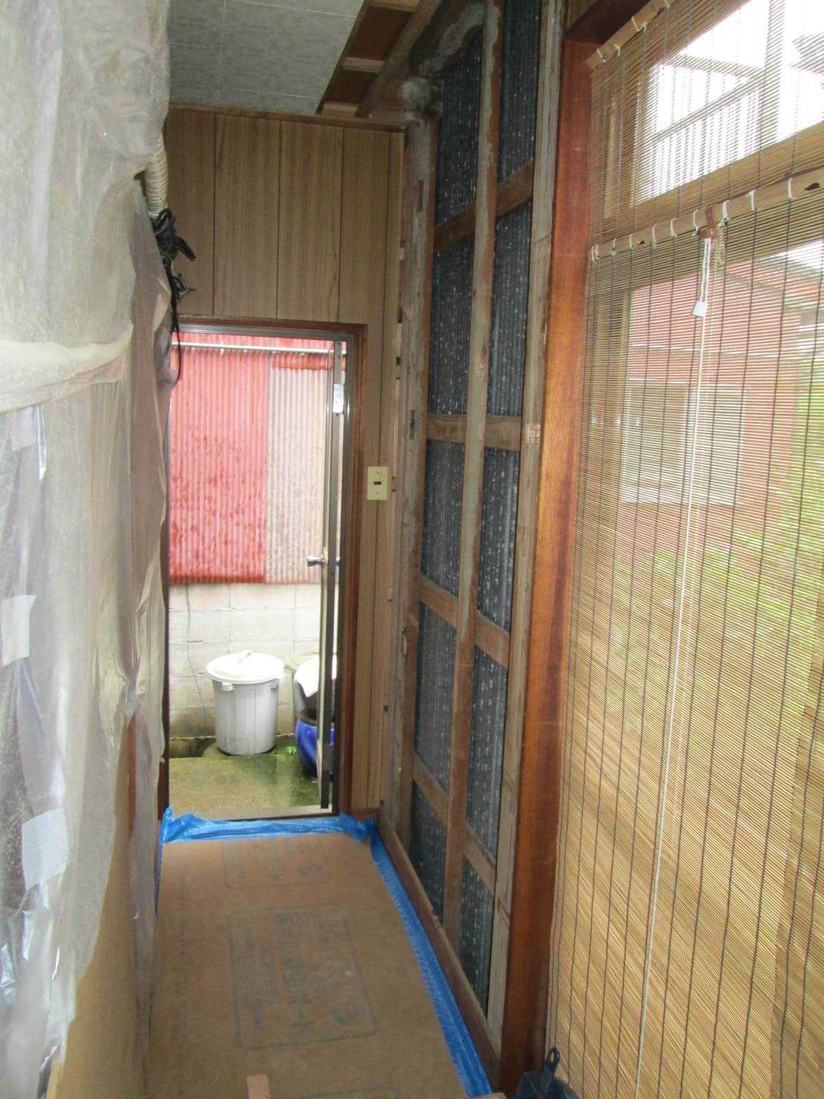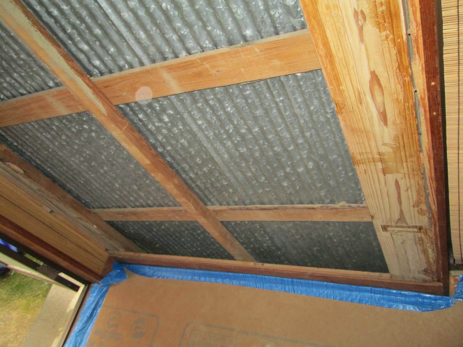 解体前の状況なんですが「縁側」です。仕上げ材は「化粧合板」です。昔はよく使われた仕上げです。厚みは4mm程度で薄いです。軽いのと加工がしやすいの大工さんが好んで使った材料の一つです。張れば仕上げも終わりますので、施工時間の短縮にもなります。