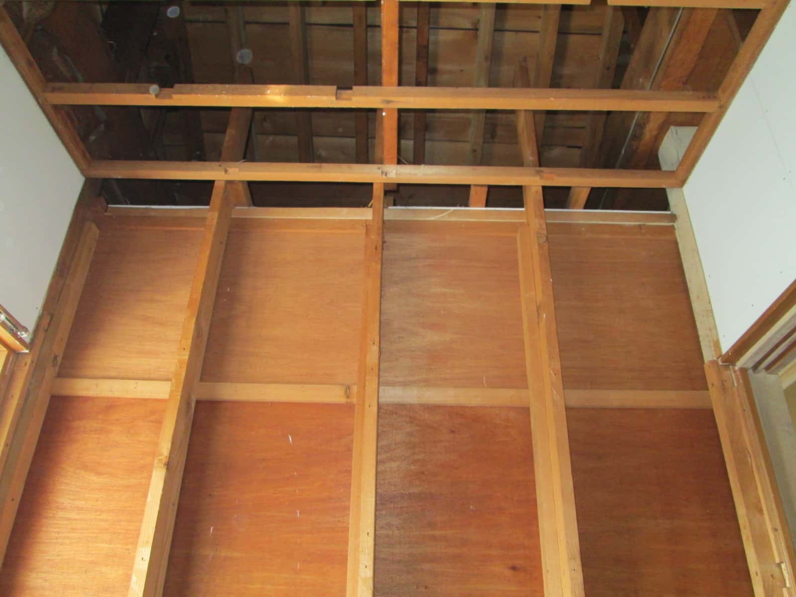 よくご覧くださいw まず、小屋組ですが、「120×180」はおろか、「120×60」すらありませんw 要するにこの押入の奥の壁は「なんちゃって壁」だったわけです。床梁の部分はどうでしょうか?拡大してみますw
