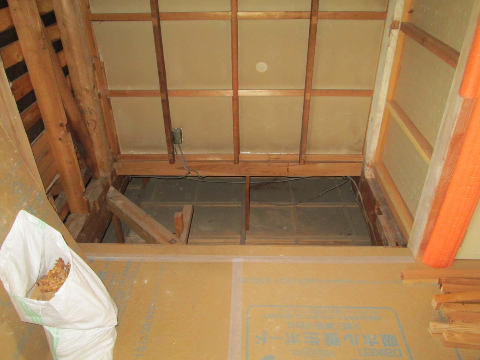 想定通りですw 床には梁があり、小屋組には梁がありません。計画でも梁を新規追加することになってますので問題ありませんw おそらく、大工さんはこの状況見たときに、