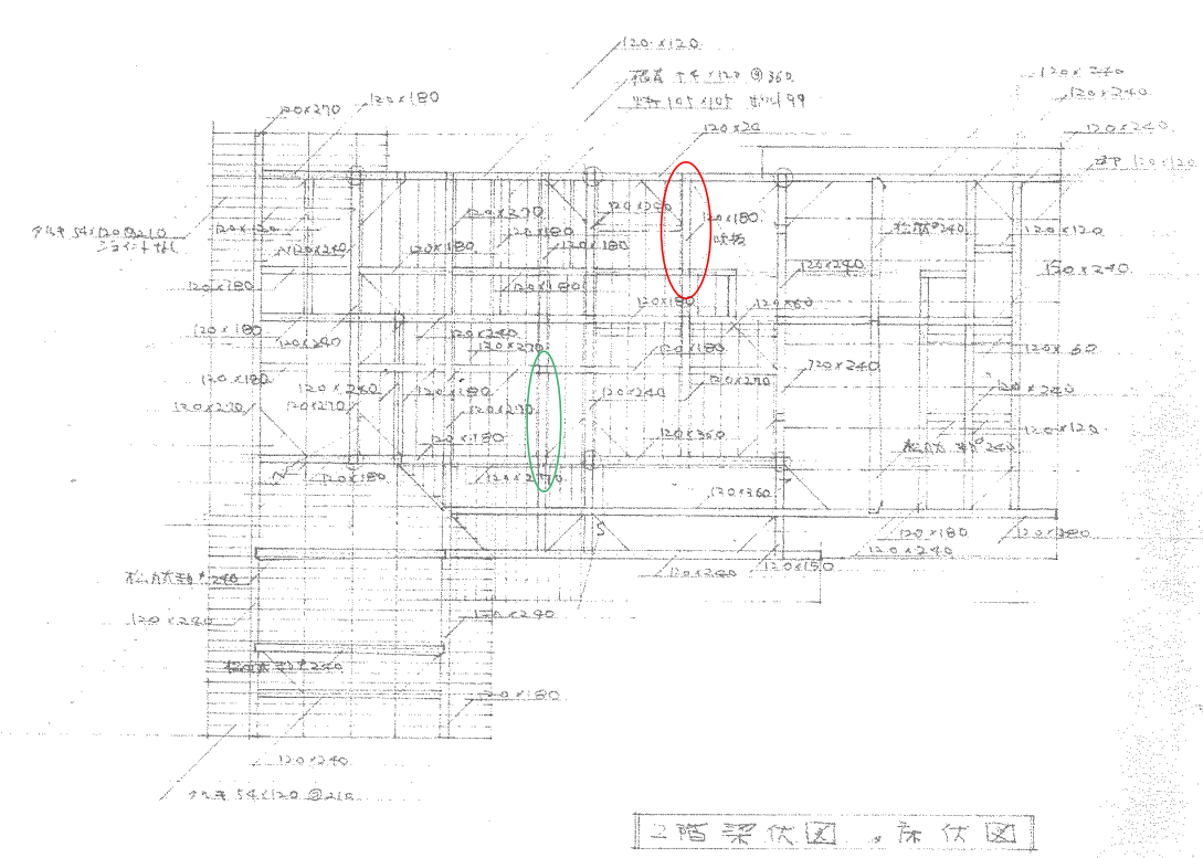 赤の部分の床には「120×180」が、緑の部分にも「120×180」の梁が存在していると読み取れます。