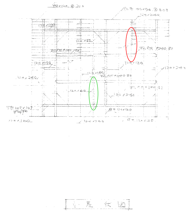 小屋組の部分はどうかというと、赤の部分には小屋梁はありません。したがって、この部分に耐力壁を増強する場合には、梁を新設しなければなりません。これは耐震改修工事としては計画にいれる内容です。緑の部分はどうでしょうか?なんとなく梁がありますし、寸法も記載されています。でも、なんとなく様子がおかしい寸法ですwww