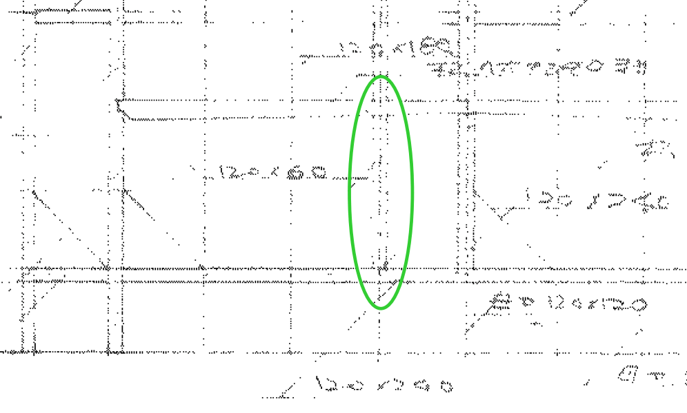 昭和50年代の住宅で、構造伏図がしっかりと設計図書の中にあるという物件はそう多くはありません。今回の案件ではこの構造伏図がちゃんとあって、目視調査の段階ではおおよそ図面と一致していたので、まぁ大丈夫だろうと高を括ってたってのが実際のところですw 画像はその2階と小屋組の構造図面なのですが、赤の部分と緑の部分が耐力壁を増強する部分の壁です。耐力壁ですので、2階床梁と小屋組に梁が存在している必要があります。