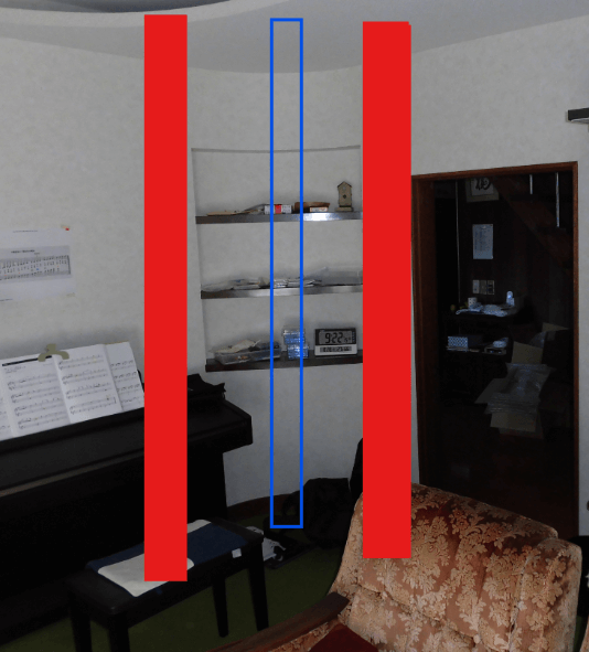 柱が入っているのは、赤の塗りつぶしの部分だけです。青線の部分が本来、角の部分になるんですが、この柱がないだけなんです。赤の柱の間をきれいにアールを付けて仕上げるというわけですが、単に壁を作るだけなら、自在に曲がるベニヤなんかでできます。でも、この物件の場合、ニッチをつけないとダメってところがややこしかっただろうなと推測します。もしかしたら、できた壁をみてお客さんが「棚がほしい」とおっしゃったのかもしれませんw