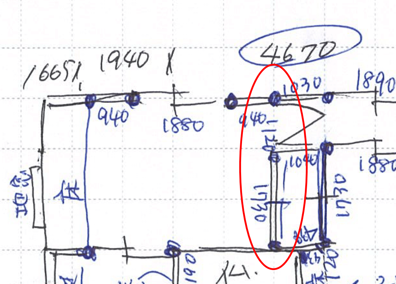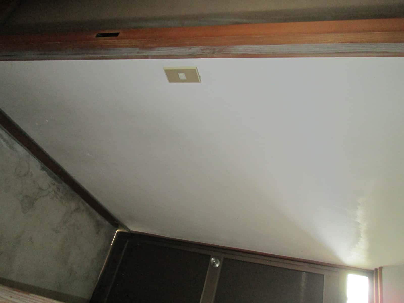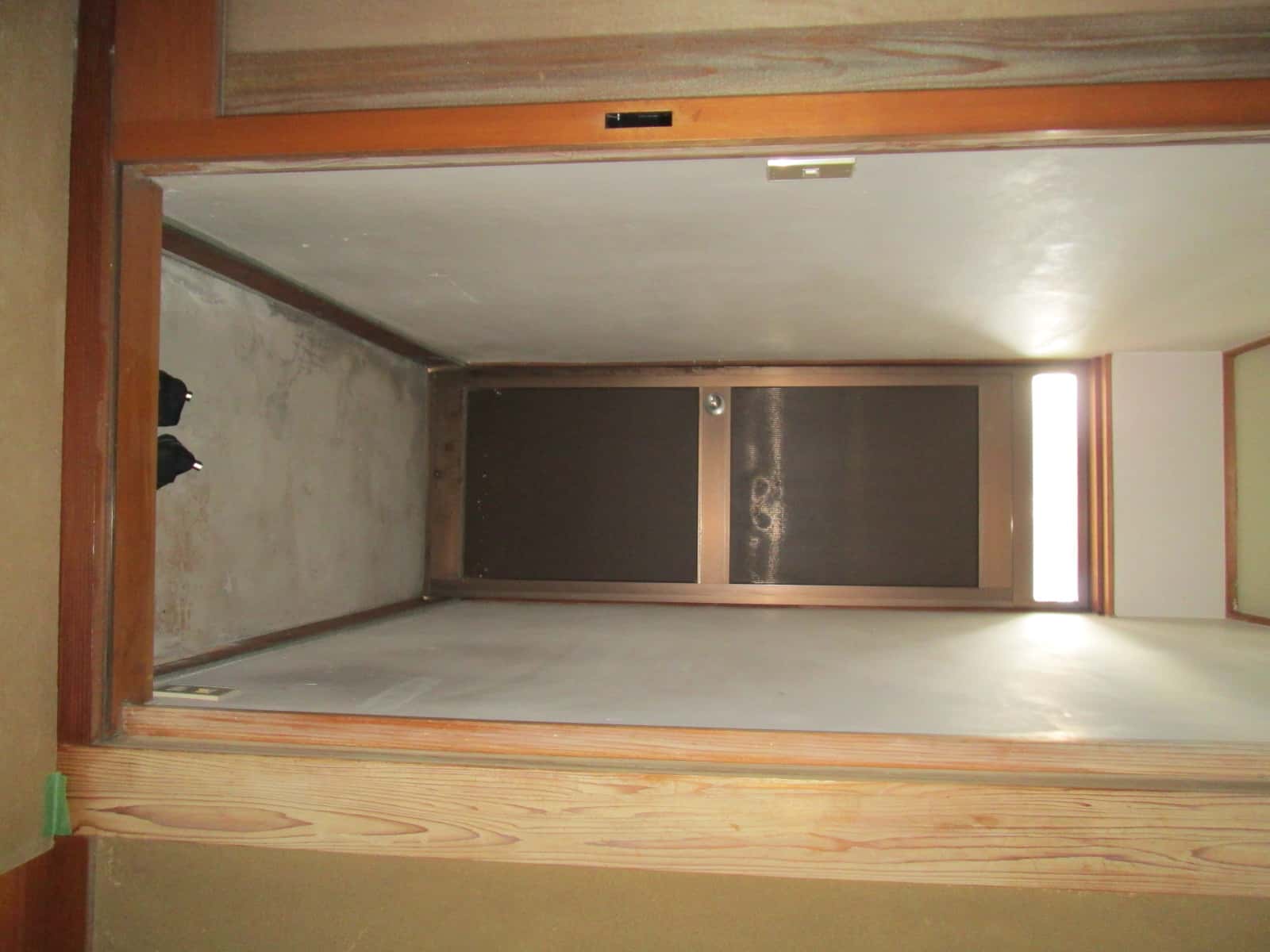 勝手口の部分が日常的な荷物置き場になっていたわけですが、耐震化という部分では、生活する部屋ではありませんから、改修でしばらく使えなかったとしても差し支えない場所で、補強プランを検討する上ではもってこい!の場所であることは間違いありません。さらに仕上げもケイカル板か石膏ボード仕上げで十分ですので、コストも低く抑えることができますし、天井を壊したところで畳1枚程度の復旧ですから、非常に工事がやりやすいところなわけです。画像に写っている両側の壁面を強固な耐力壁とする計画です。