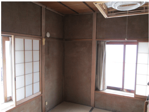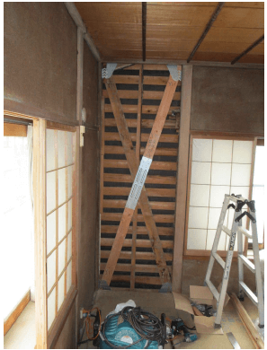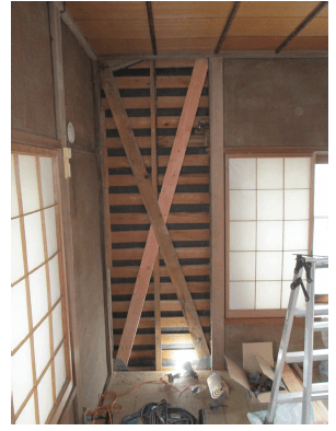 例えば、以下の画像は和室の壁の補強ですが、建物全体が土壁となってましたので、そこに筋交いをダブルで配置し強化する計画をしていました。そこで土壁をおとしてみますと、その土壁の中から見事に筋交いがでてきたのですw