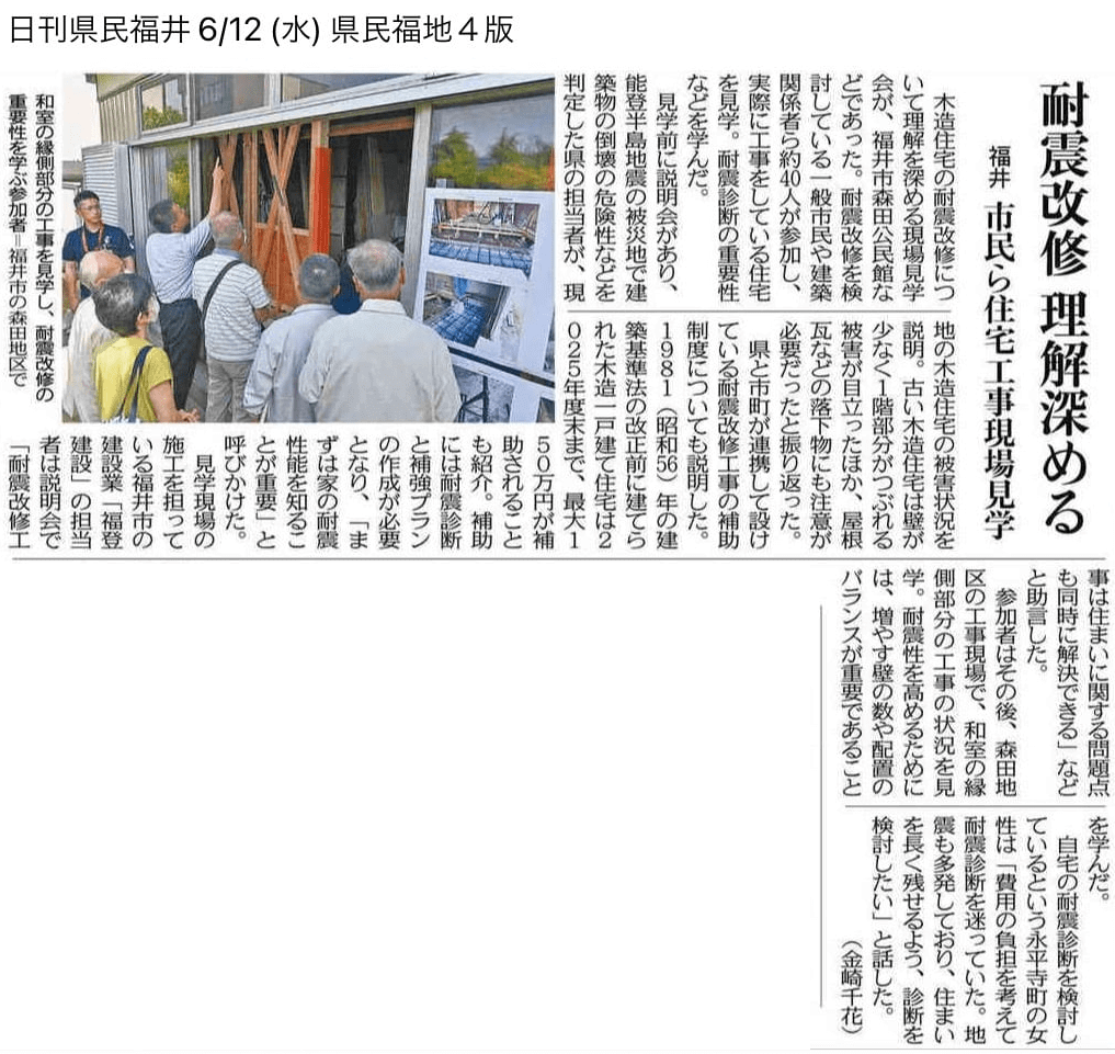 先日、ブログでアップした「R6年度 第1回木造住宅耐震改修現場見学会」ですが、説明会の様子の画像は公開しましたが、現場見学会の様子の画像は公開していなかったので、今日はその様子をアップしたいと思います♪