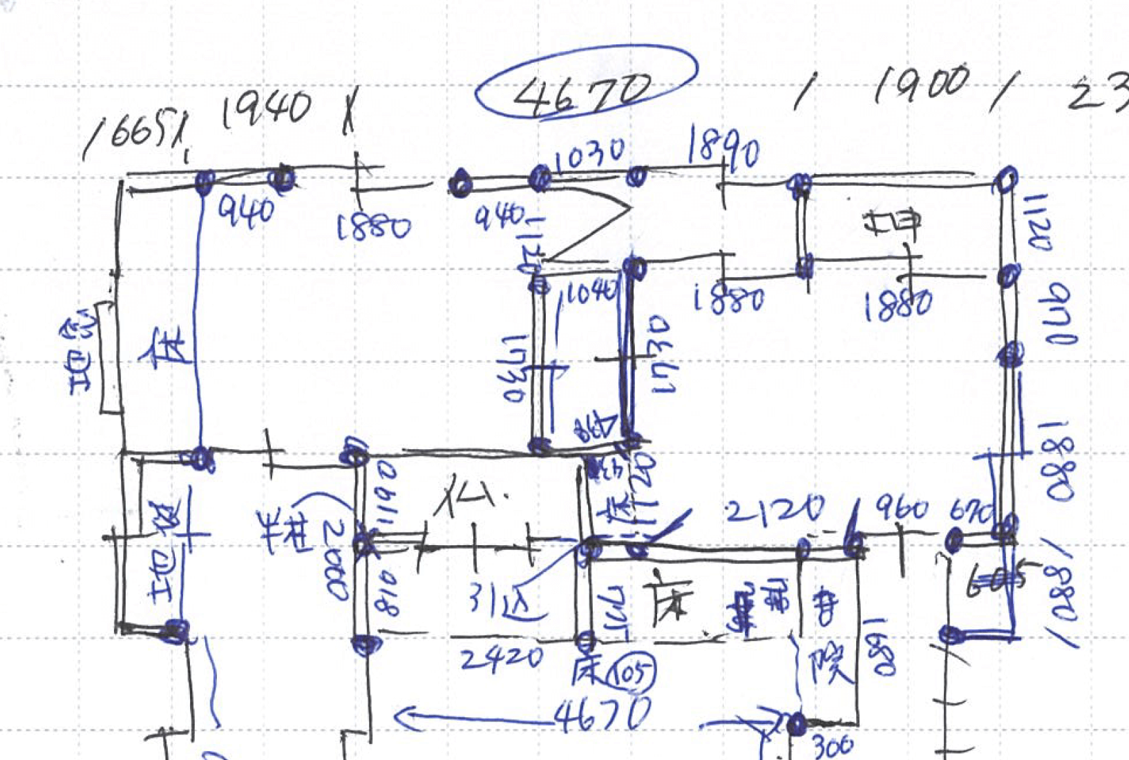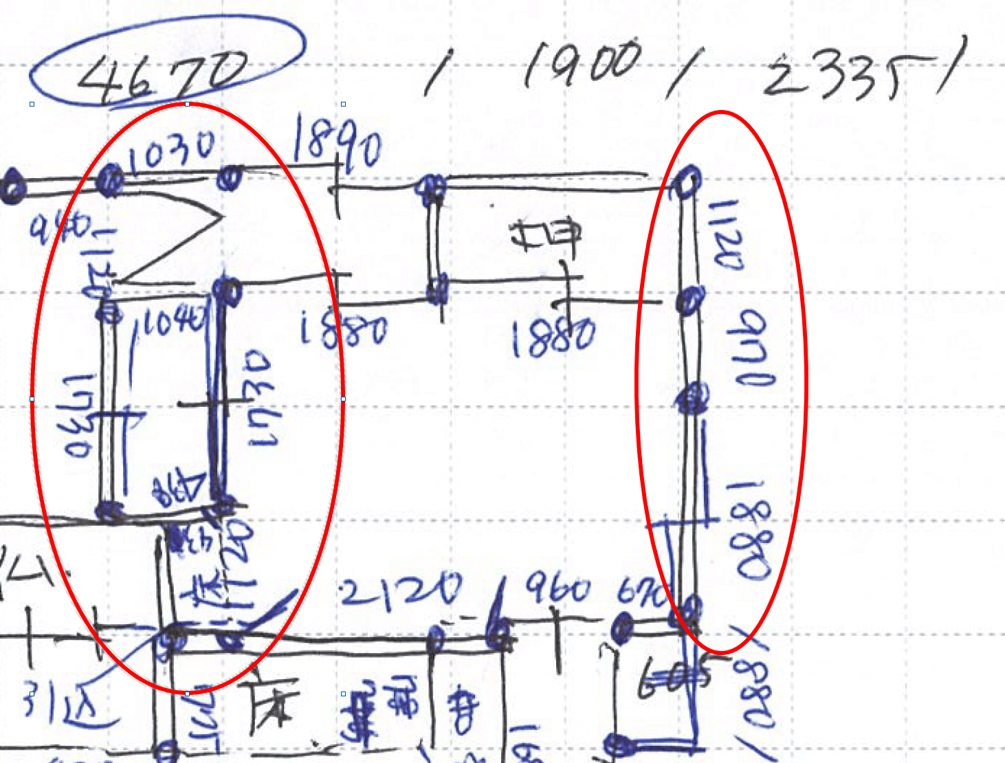 また、計測結果が、938とかになった場合というのは、柱そのものの収縮などによる影響もありますので、計測結果から新築時にどのような考え方で柱割りを行ったか?という「推測」を行うことが必要になります。まぁ、慣れればたいがいわかりますが、たまに、図面化して、調整しないと結論が出ないというときもあります。