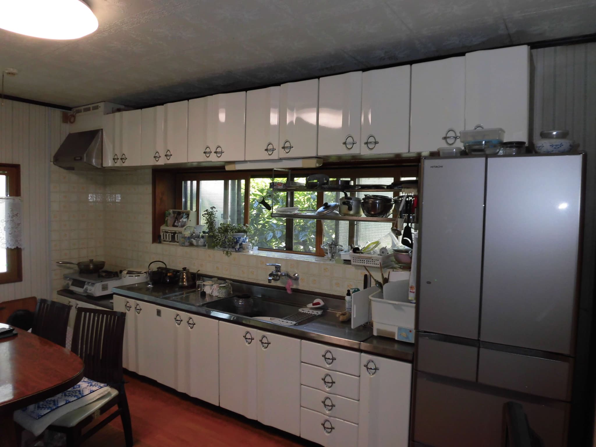 こんな感じです。どうみても、シンクなどの部分が3.6mあり、それにプラスされること約90cm分のガステーブルが存在しています。つまり、設計図書よりも、おおよそ90cm、3尺ほど大きな部屋になっているのです。幸い、このお部屋の上の階はありませんでしたので、2階の間取りの状況が記載と違うとはなりませんでしたが、図面がある!ということで間取りの寸法確認などを怠れば、耐震性の診断ではかなりまずい状態になりかねません。ですが、ないよりあったほうが楽になるのは間違いないのです。