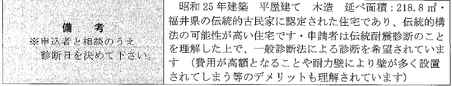 こんな感じの依頼書がFAXで送られてきます。この依頼書に受けるか受けないかの回答を行うわけですが、この段階では、備考欄に書かれている内容レベルの情報しかありません。まだ、書いてあればマシなほうですが、市町によっては空欄だったりします。もちろん、申し込まれた方の住所連絡先の記載がありますので、そこからグーグルマップなどで建物状況を確認することはできますが、年数がかなり古いとか、増築が繰り返されているなどの情報はほとんど教えてもらえない状況での依頼書となります。ちなみに、福井市からの派遣依頼は、相当細かい情報を記載してくれてることが多いので助かります。