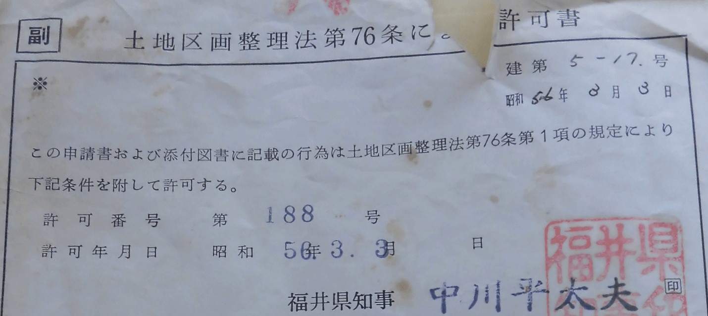この中に、土地区画整理法第76条関係の許可書がありました。確認申請書、同済証などは見当たりませんでしたが、許可要件での添付資料としては少なくとも図面は必要なので、それなりに整備されている「はず」の設計資料だと判断しました。いずれにせよ、図面復元作業はすさまじく楽になります。要するに、この図面と違うところを探していく、あるいは計測していくだけの作業になるからです。あとは、小屋裏や基礎の状況を天井裏、床下である程度調査する程度で済みます。