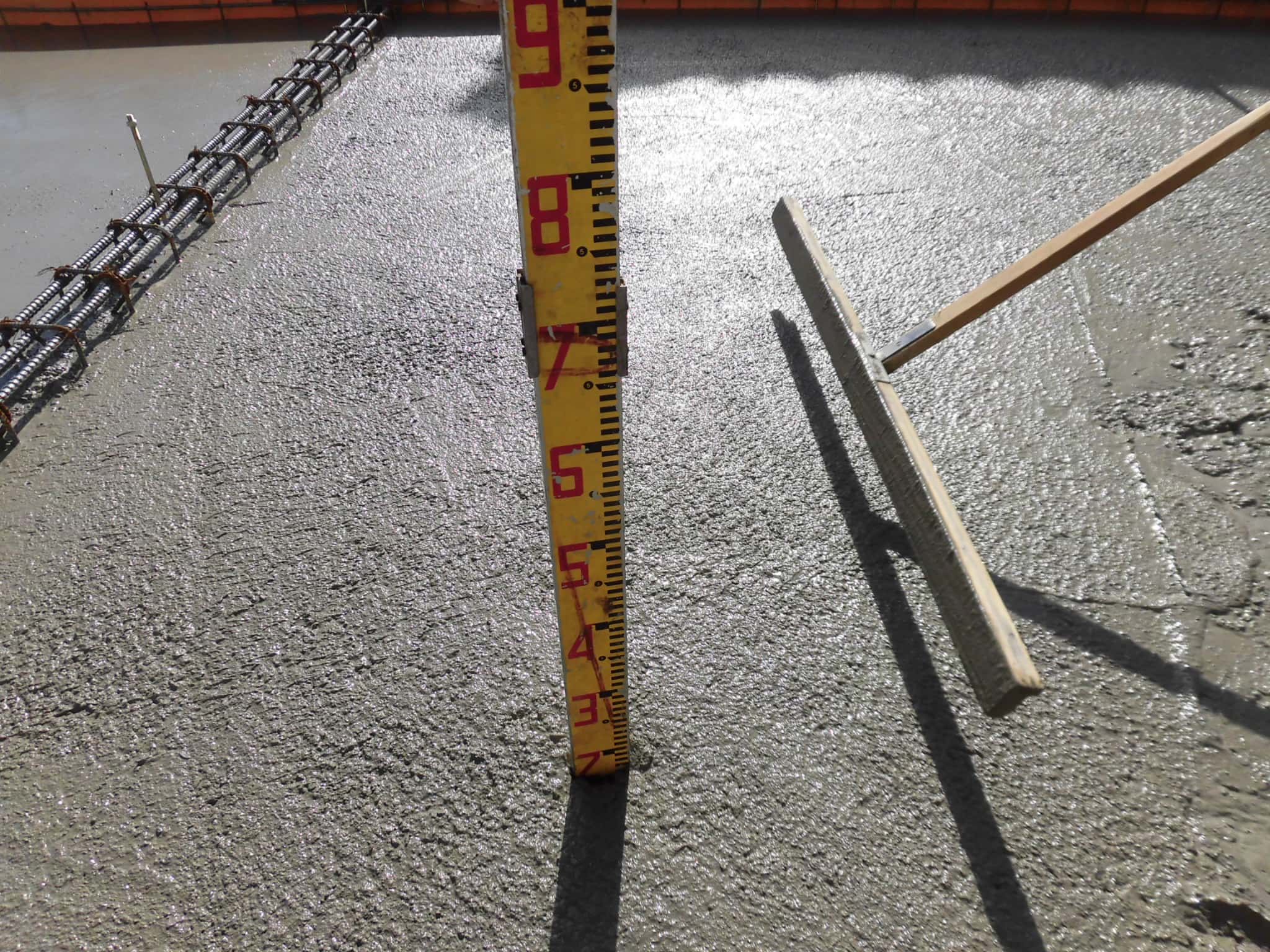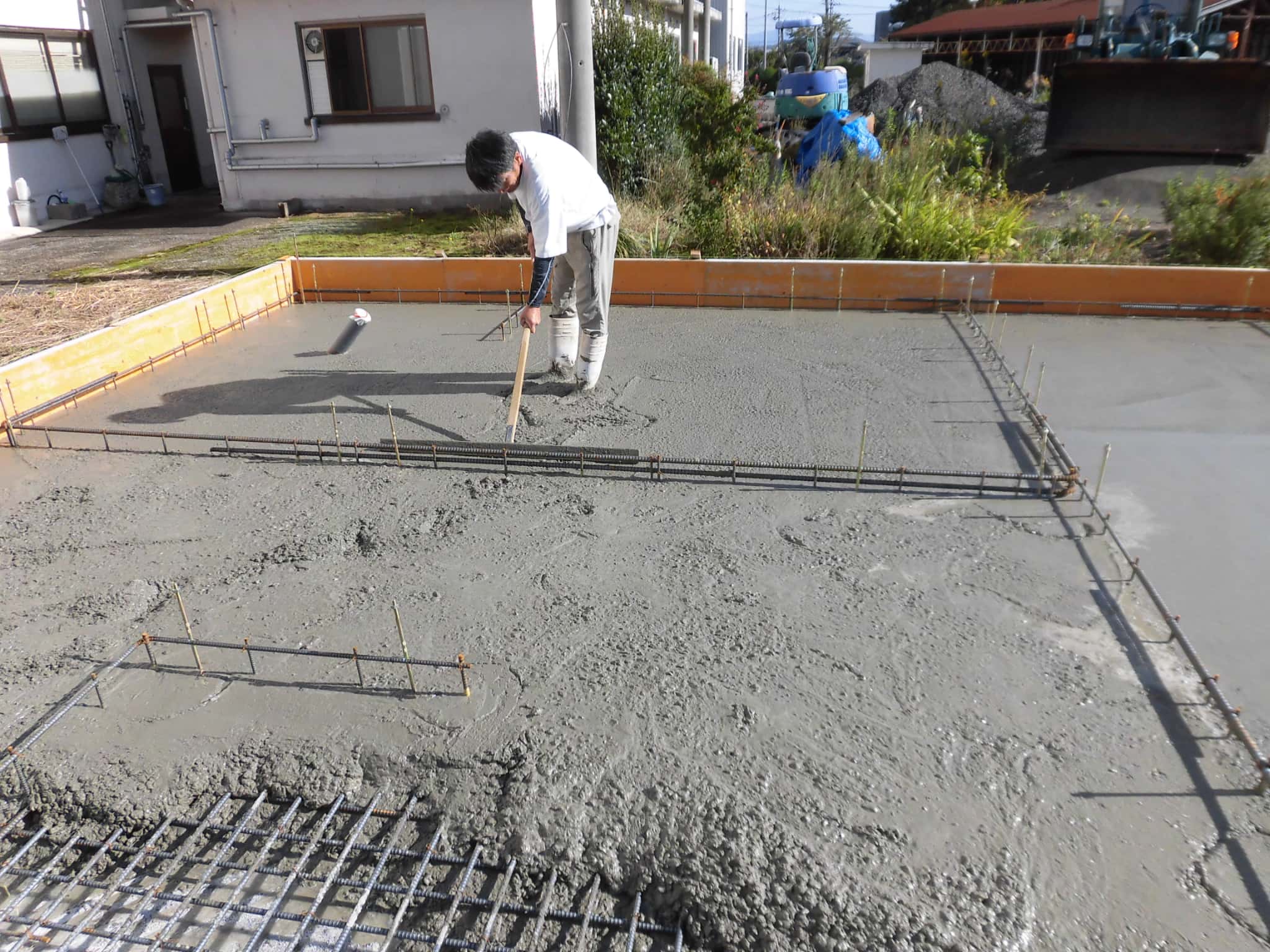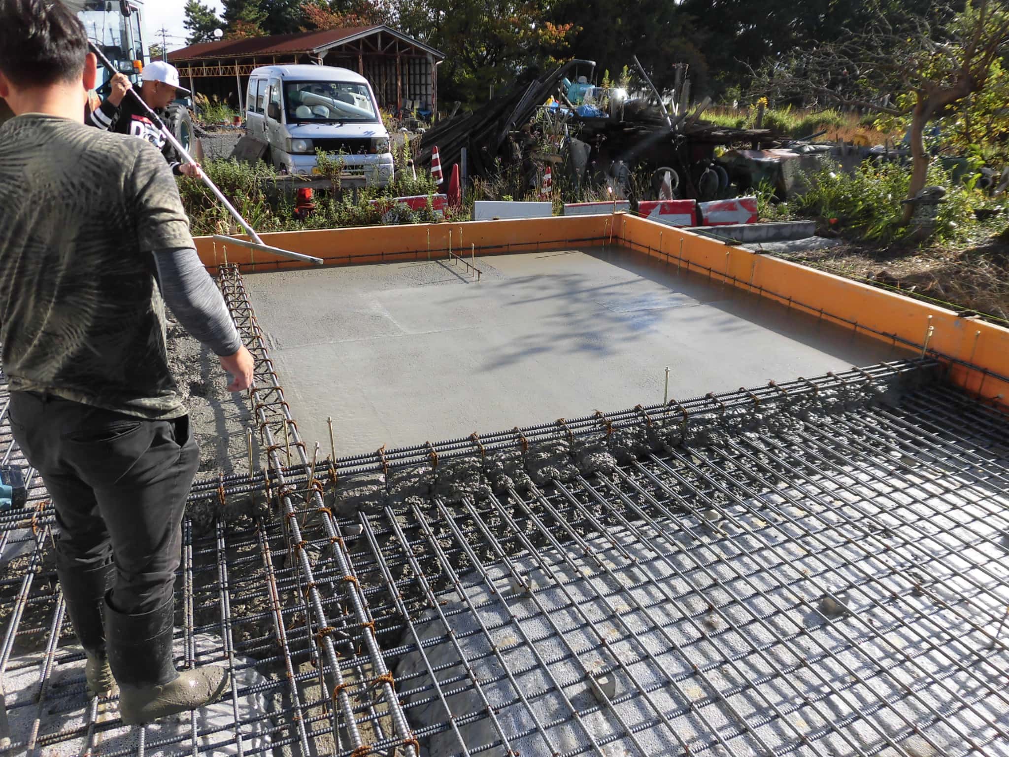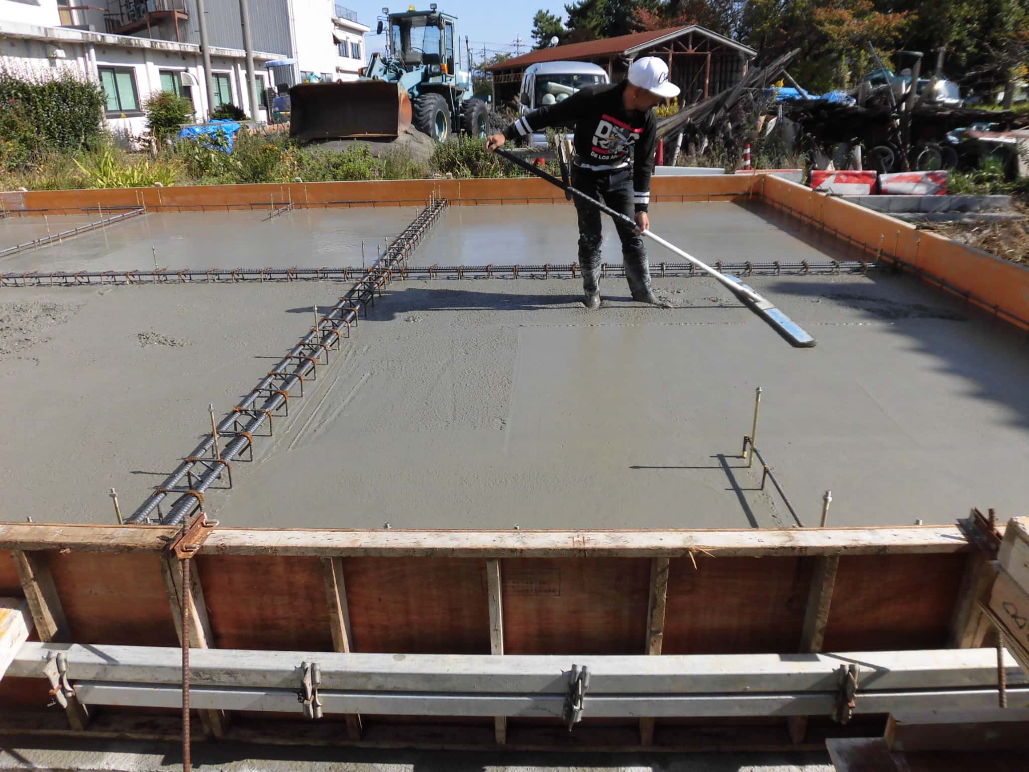 この「厚み」を一定にするという技術は、簡単そうに見えて、実はそうではありません。厚みの基準となる「墨」を型枠に出していくことだけではなく、版の中央部や、基礎の立上りの部分に高さの目印をつけていき、さらに、その目印に向かってドボドボと入れ込んだ生コンを「ならしていく」という作業が必要なわけです。