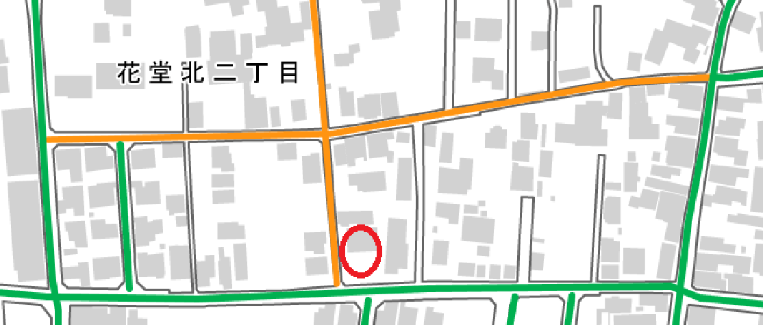 また、除雪対象路線には、市が除雪を行う道路と、そうでない道路の区分けがあります。例えば、以下は弊社の事務所がある「花堂北2丁目」ですが、緑の色の道路とオレンジ色の道路があります。