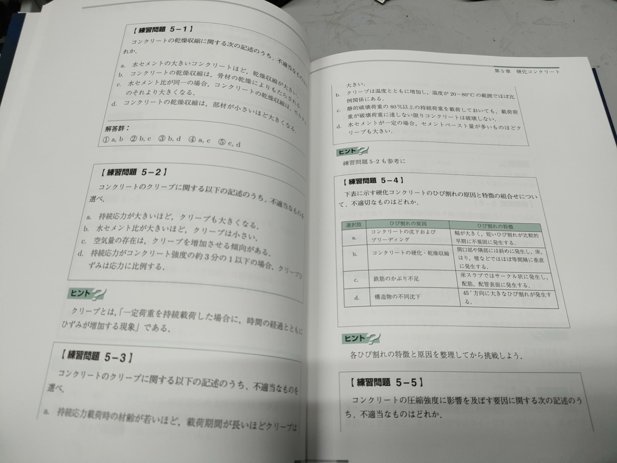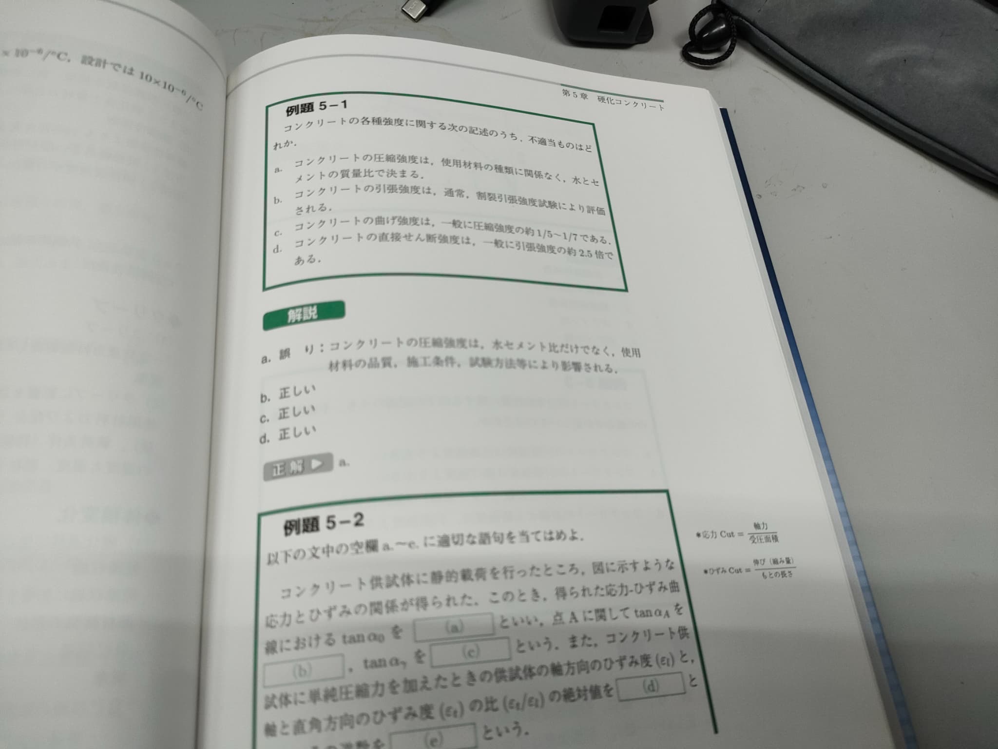 ページの構成ですが、コンクリートに関する基本的な項目の解説からはじまり、それ関する例題があって、最終的には、その章の練習問題が掲載されています。