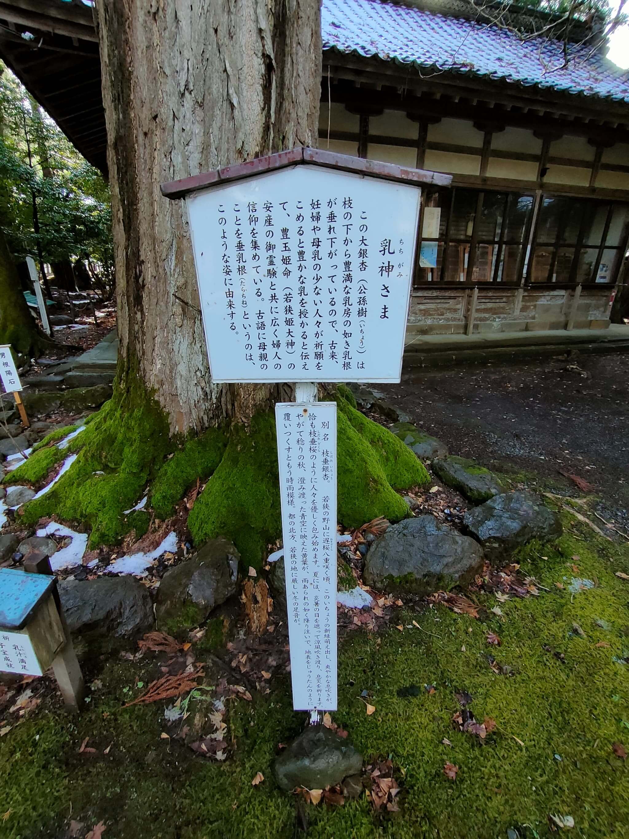 「乳神さま」として崇められている御神木です。御神木の見え方が女性の乳房のように見えることから、安産祈願の御神木として信仰されているようです。