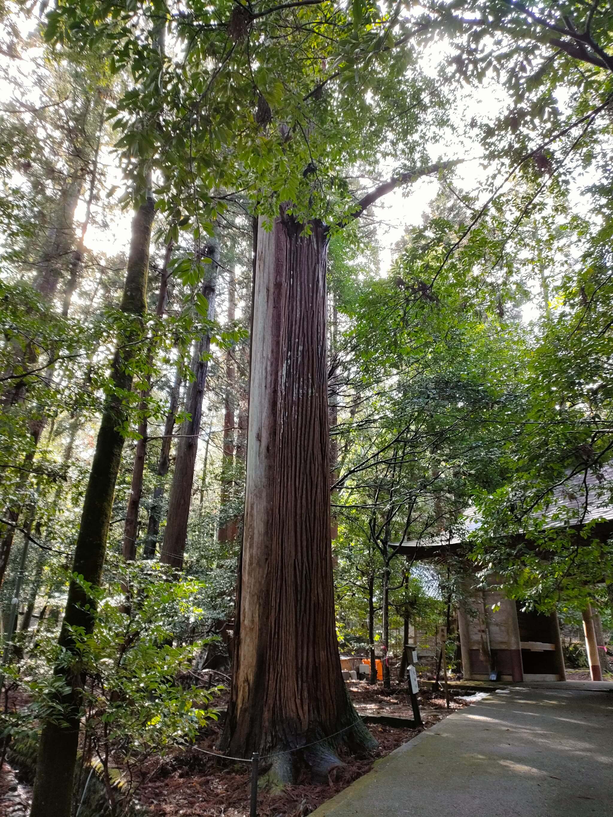 仰ぎ見るとこんな感じです。参道を行くと、中門がみえてきますが、ここになんと「夫婦杉」といわれる巨木があります。
