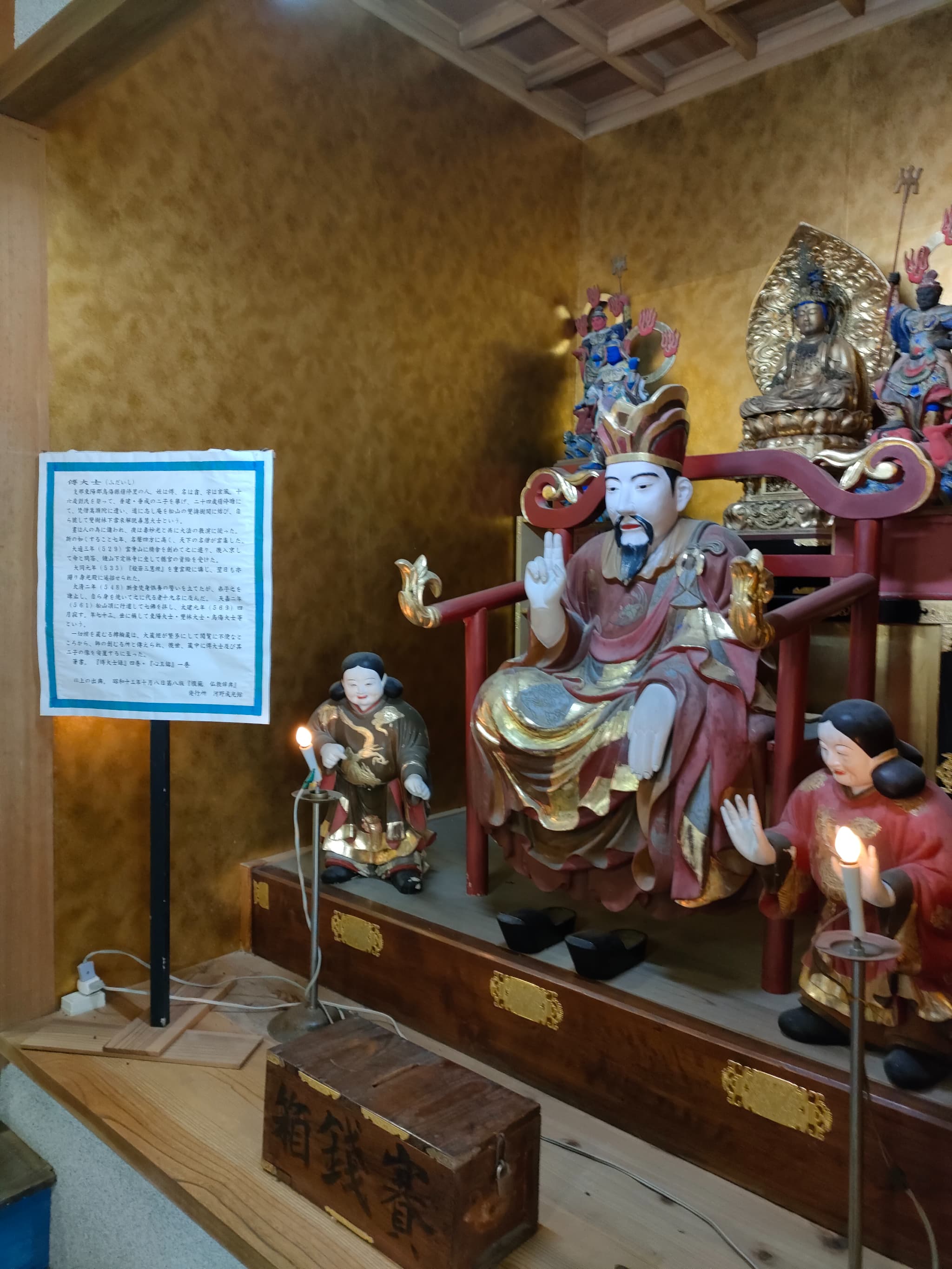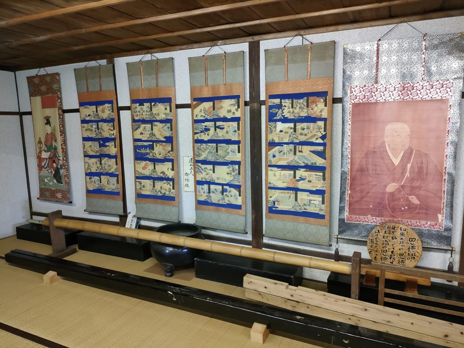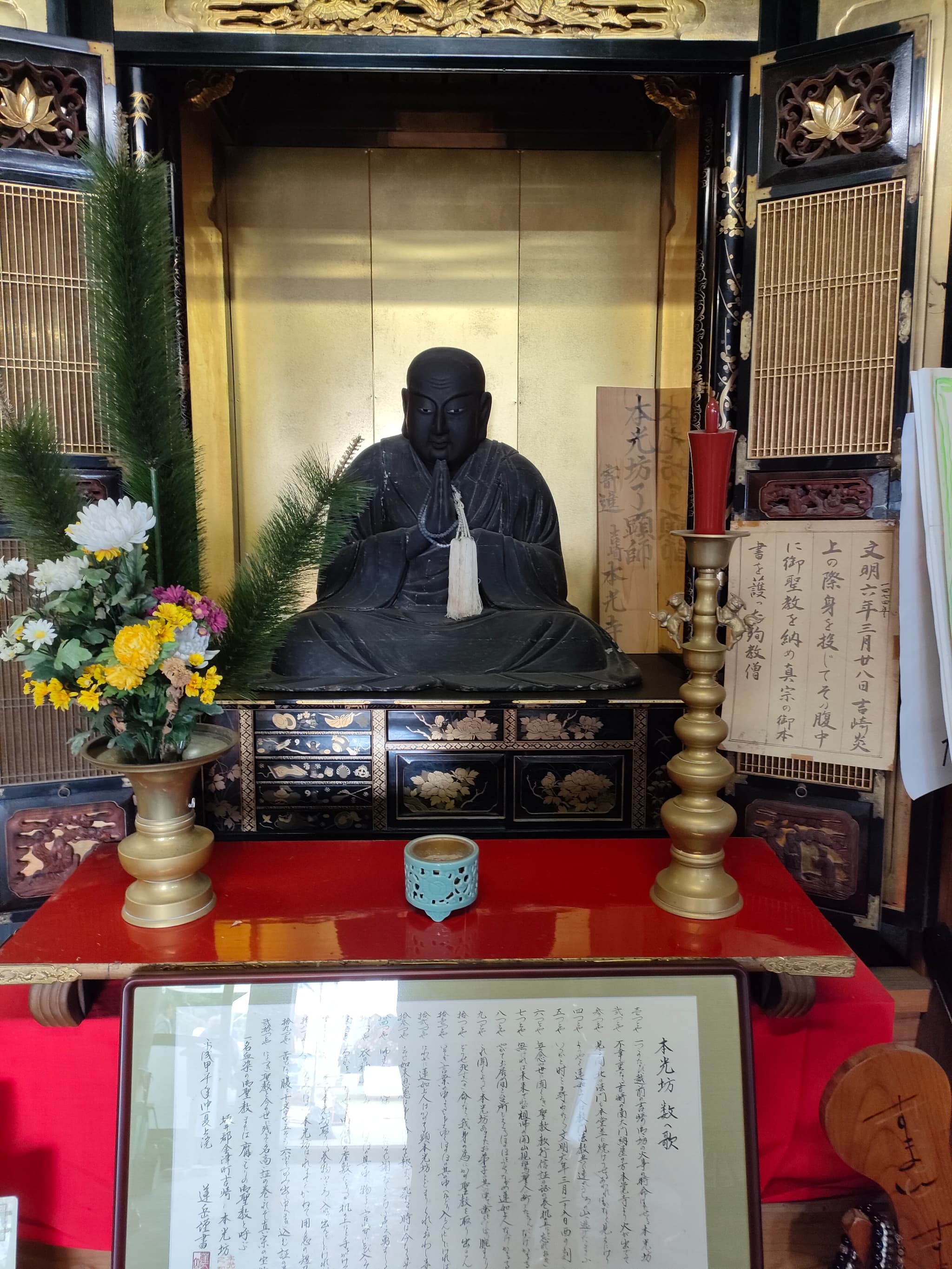御坊には宝物館という施設があり、ここでは、蓮如上人や吉崎御坊にまつわる仏具や上人像などがあります。本光坊さんの像には、この方が吉崎御坊が大火により焼失した際に、経典などが燃えることを防ぐために、自らの腹を裂いて経典を隠し、自分の体が燃えても経典を守ったという話しが説明されています。