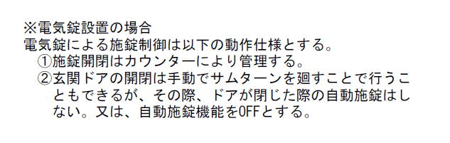こんな感じです。電気錠の動作仕様を書き、それが法的な規制をクリアしていることを示す必要があります。ここでは、電気錠が管理者のいるカウンターで開閉操作できること示し、その上で、玄関ドアがサムターンを手動で廻すことで解錠できるけど、ドアを開けて閉じても自動施錠しない仕様としているということです。要するに、避難するときにサムターンを廻す、鍵を開ける、ドアを開ける、外に出る、ドアが閉まる、で、鍵がかかってしまうと連続的に人が外に出れないので、結果として玄関に避難者が滞留してしまうわけで、そういう仕様ではありません、と示す必要があるわけです。実際、サッシメーカーさんが用意する電気錠や、鍵メーカーさんが提供する電気錠の場合、これ以外の仕様であることはほとんどないはずです。