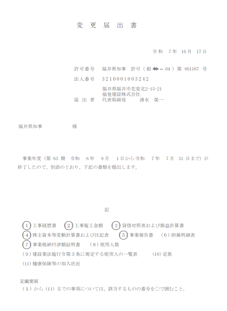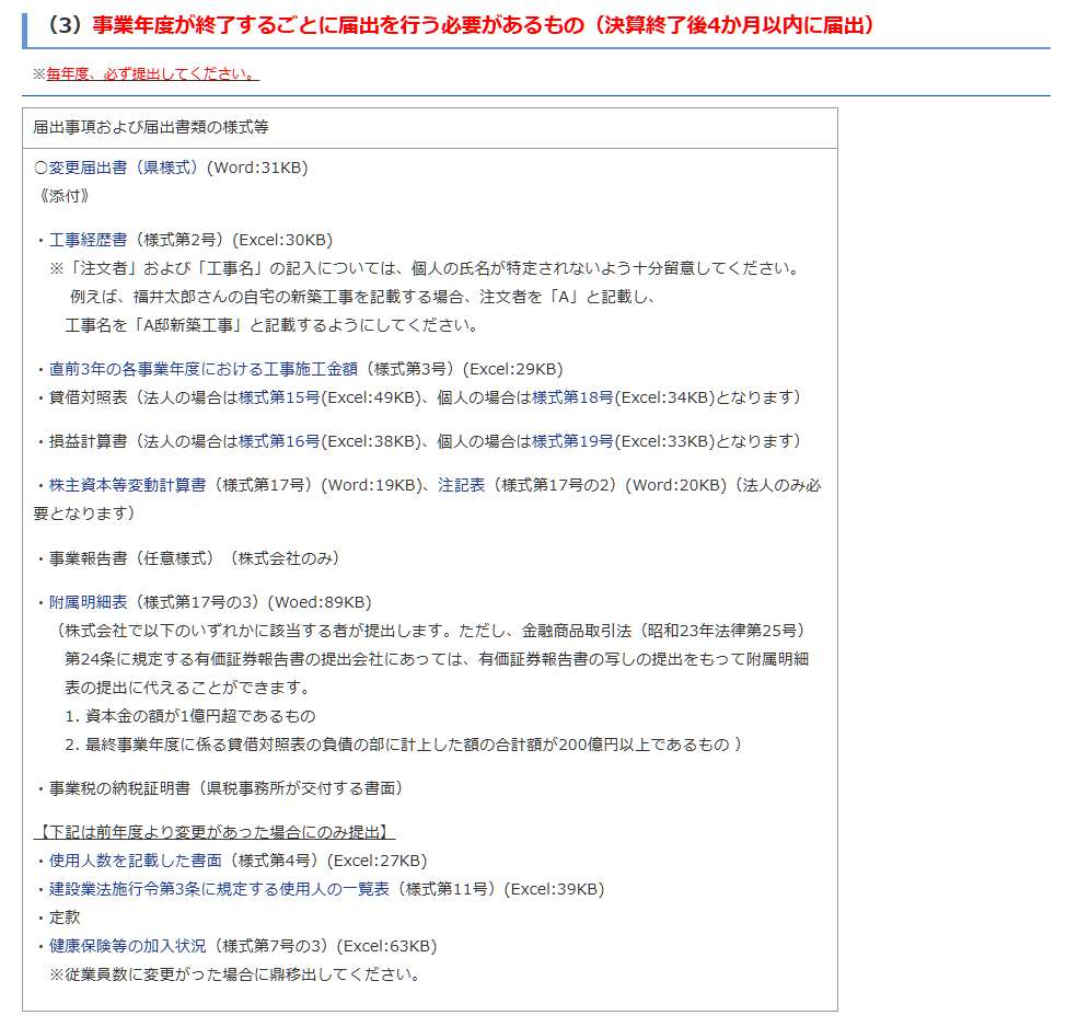 この画像は、福井県のホームページの「建設業許可」関連の案内です。事業年度終了時の届出については以下のような記載があります。