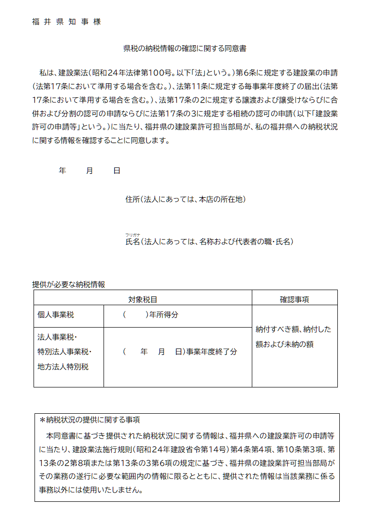 私は、建設業法(昭和24年法律第100号。以下「法」という。)第6条に規定する建設業の申請(法第17条において準用する場合を含む。)、法第11条に規定する毎事業年度終了の届出(法第17条において準用する場合を含む。)、法第17条の2に規定する譲渡および譲受けならびに合併および分割の認可の申請ならびに法第17条の3に規定する相続の認可の申請(以下「建設業許可の申請等」という。)に当たり、福井県の建設業許可担当部局が、私の福井県への納税状況に関する情報を確認することに同意します。