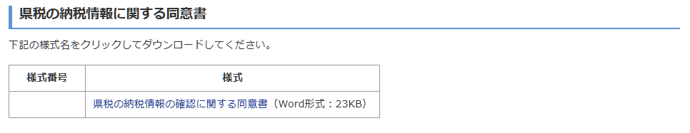 に対しての「同意書」を提出します。これにより、いわゆる「県税の納付状況の証明書」をこちらで取得する必要がなくなるわけです。