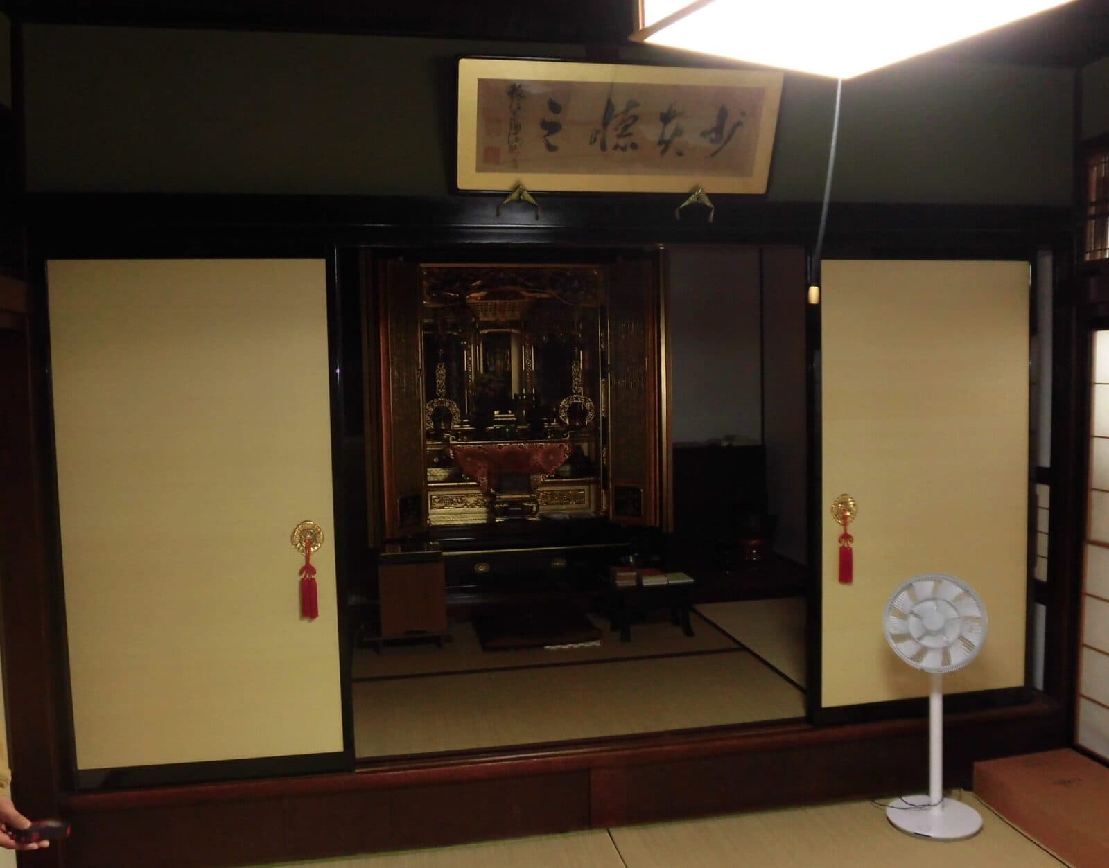 この仏間には付帯して、お寺の方の「控えの間」がつくられます。ここで、お坊さんにお茶をだしたり、御着替えをしていただいたりします。客間とは別次元の場所です。それでは問題の開口部ですが、以下の画像をご覧いただくと仏壇の後ろ側になにかありますw