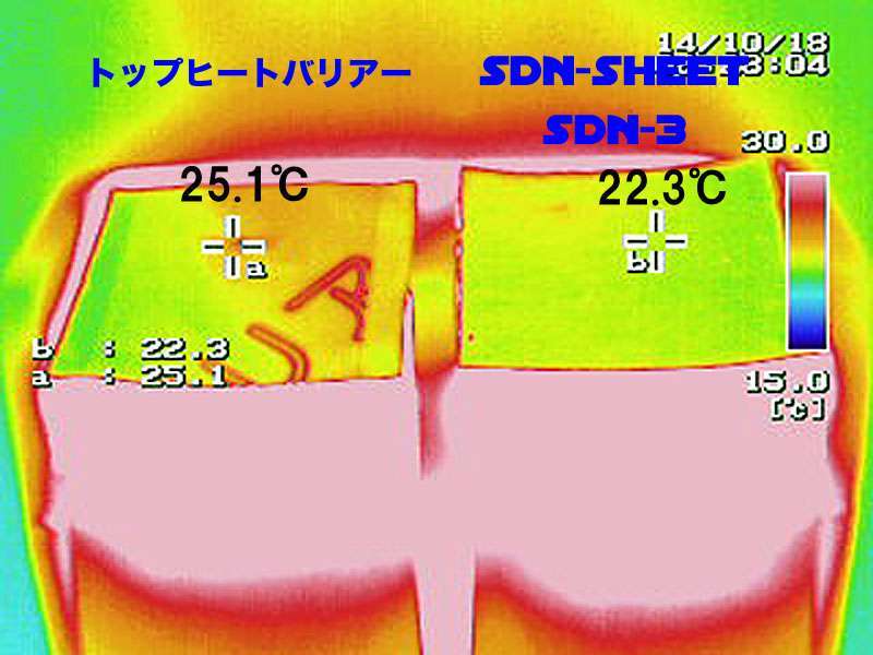 今回の対戦相手は0.1mm厚と言う薄いシートですから、SDN-SHEETも一番薄いSDN-3(3mm厚)です。結果としてはサーモ画像の通りなかなかの健闘ぶりです。と言っても、厳密にはSDN-3の方が遮熱性能が高い事が分かります。もう少し判りやすくするために温度表示を少し変更しました(画像3) 確かに 0.1mm VS 3.0mm と30倍の厚さもあるから勝って当然かな(^^ゞ
