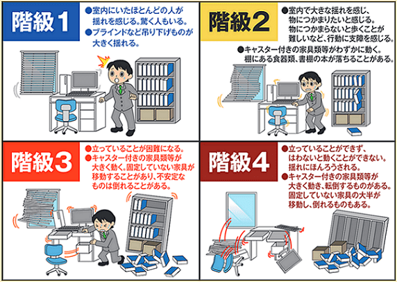そして、この「長周期地震動」にも、震度と似たようなレベルを設定し、震度による揺れの強さだけではなく、建物内部に居たときの影響度合いも情報として発表することになりました。それが、「長周期地震動階級」というものです。階級のイメージは以下の画像のような感じです。