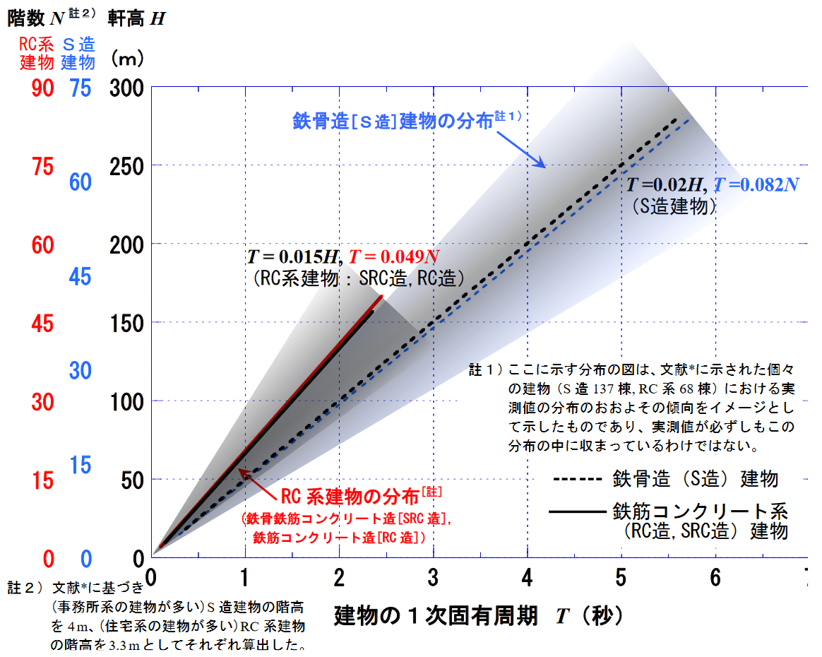 高層建物の固有周期と建物高さ・階数との関係 気象庁ホームページ「固有周期と建物の関係について」より