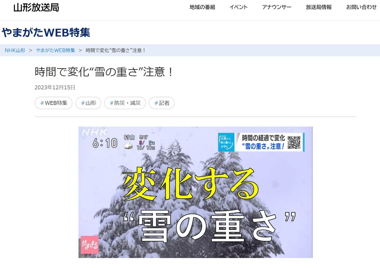 NHK山形放送局、「やまがたWEB特集」にて、「時間で変化“雪の重さ”注意!」というものが出されていました。放送でもオンエアーされていたので、ご当地の方で目にされた方も多いのではないか?と思います。