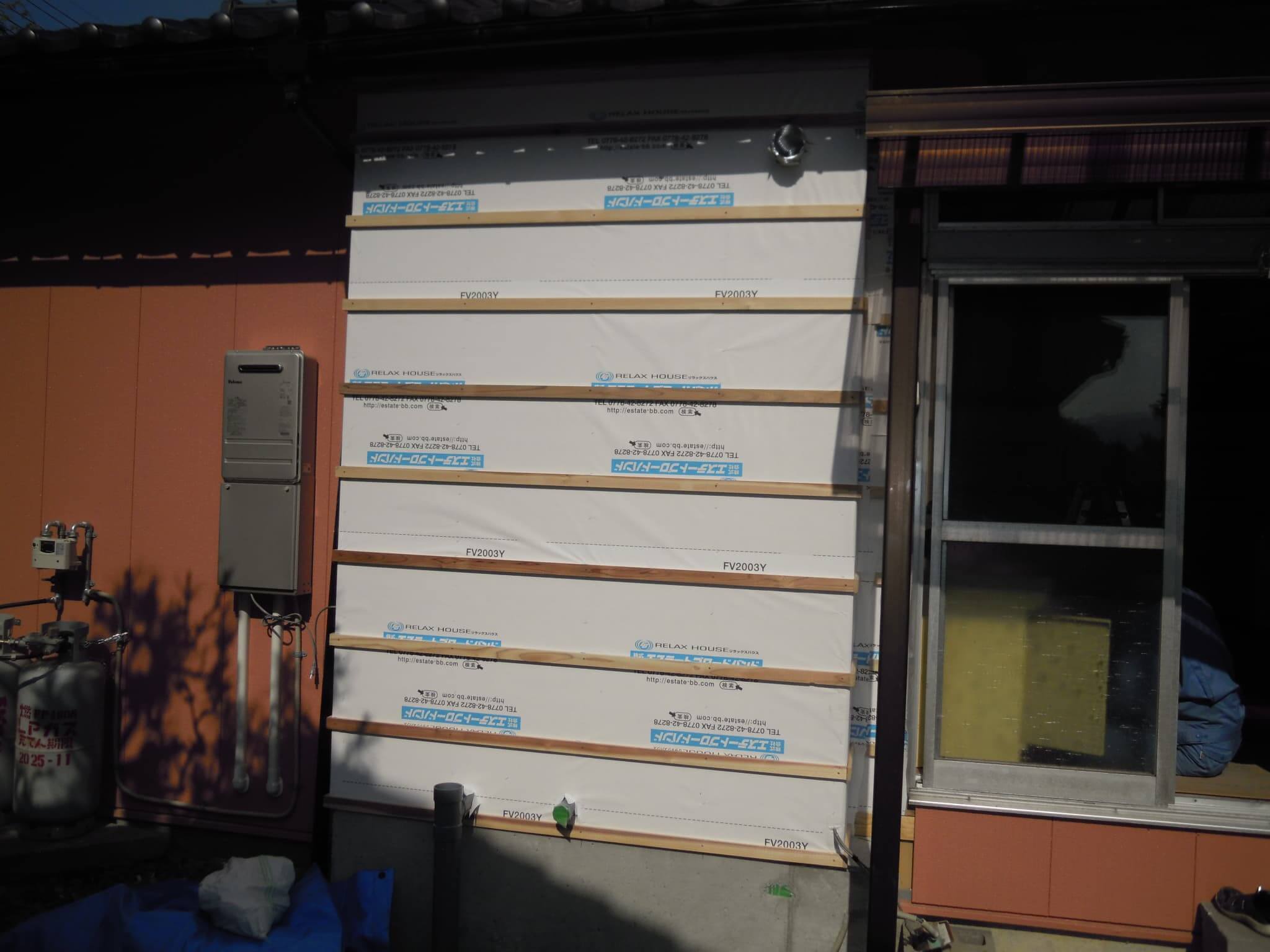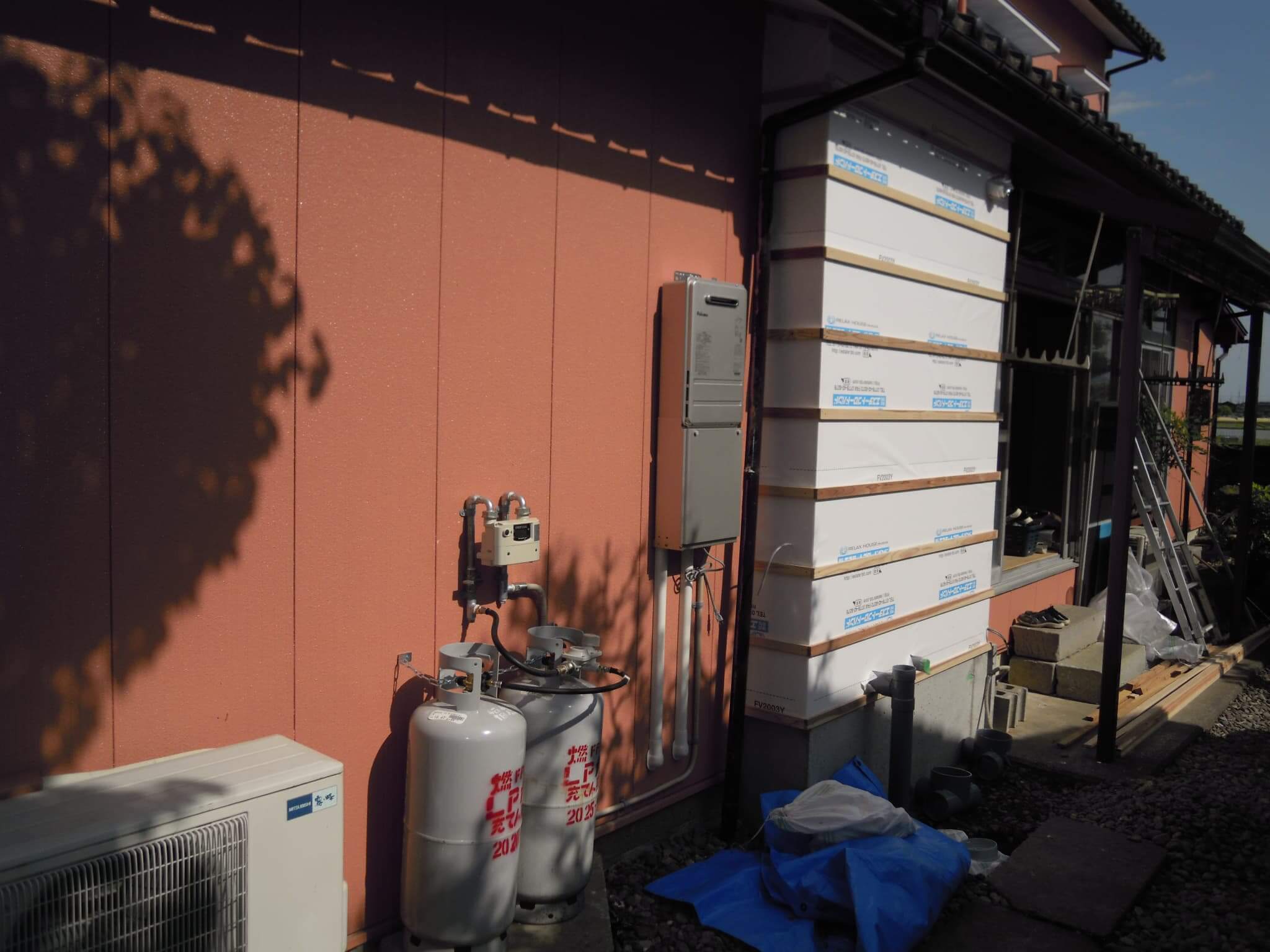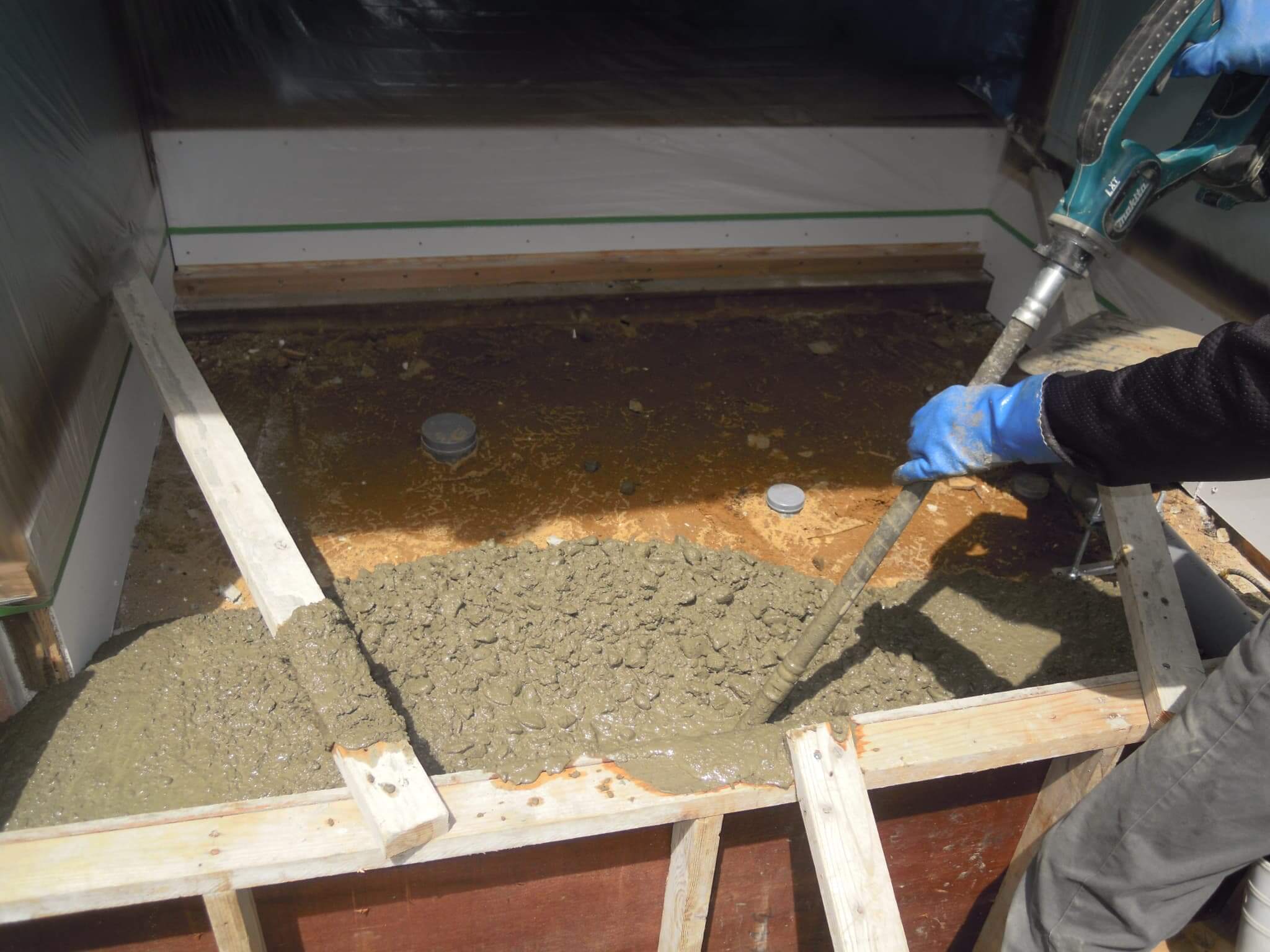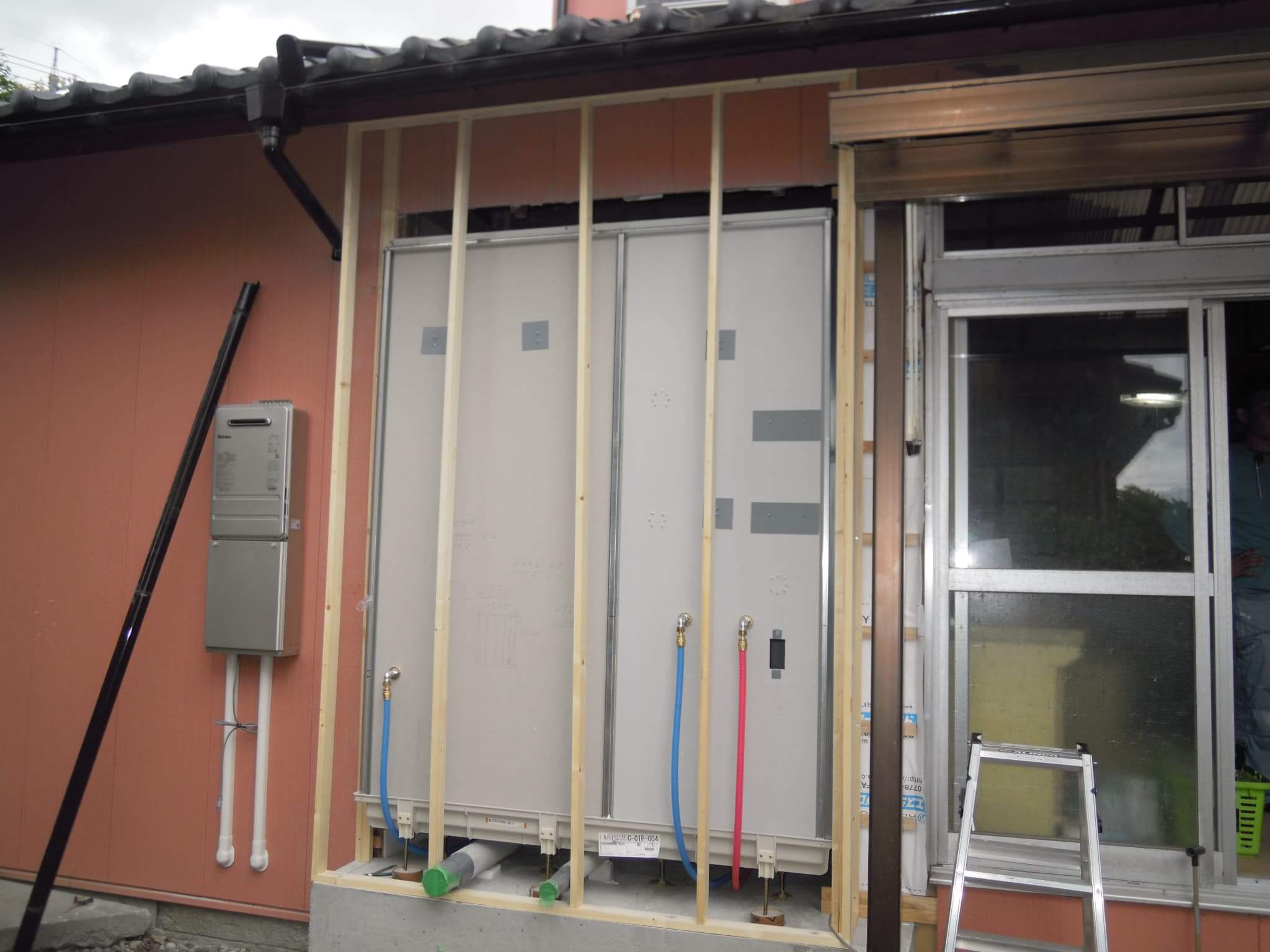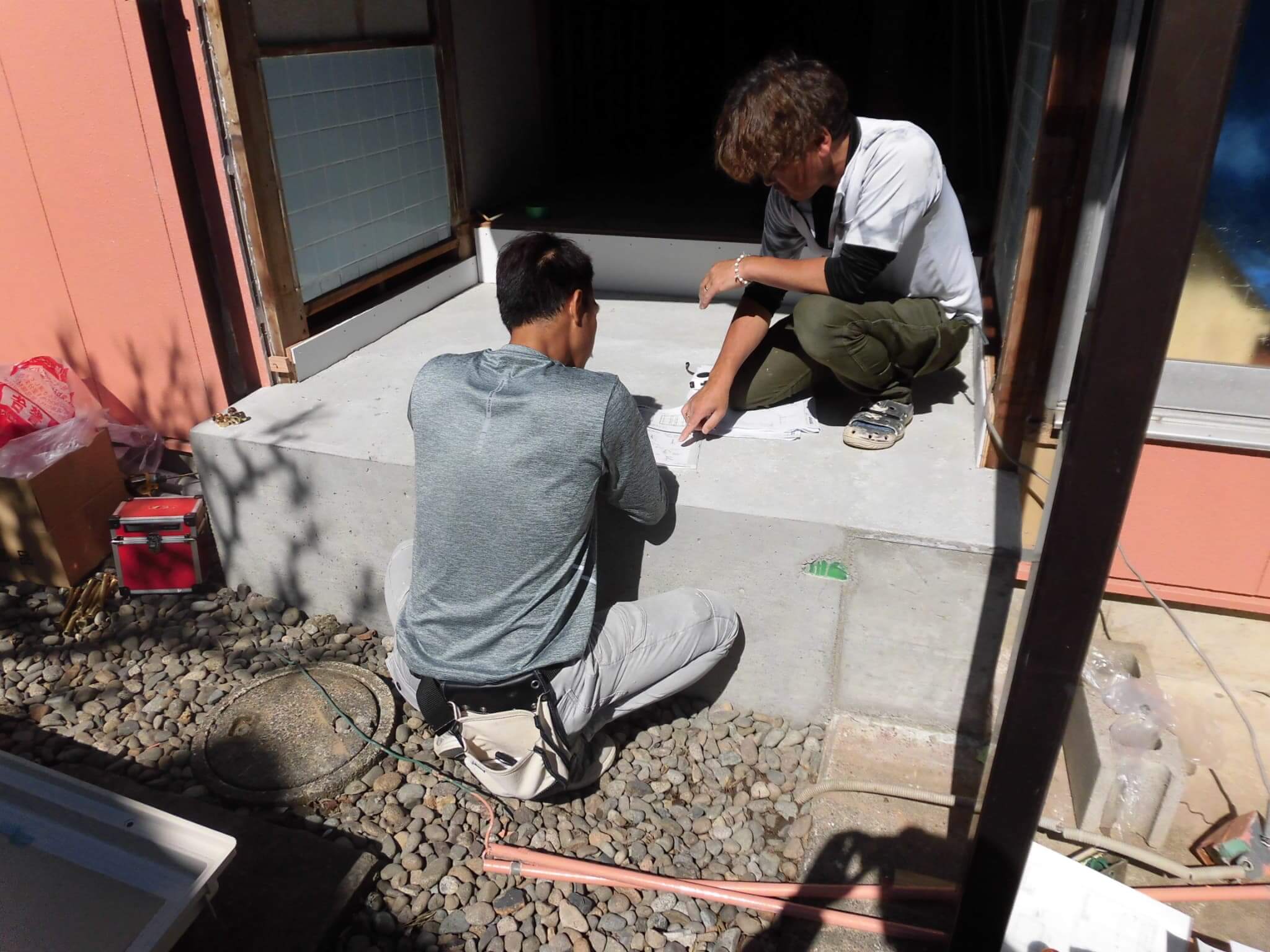 という流れになります。④ユニット設置が⑤外装及び内装工事に先んじて行うのは、ユニットの搬入設置に場所を取るということが理由なのですが、一般的な住宅用システムバスとはちょっと違うユニットの性質上致し方ありません。外装がユニット設置後になるというのは天候によって雨の吹込みなども懸念されますし、元より戸締りなど防犯上の問題もありますので苦渋の判断ということになります。以前のブログでは①の様子をアップしておりますので、その続きとなります。