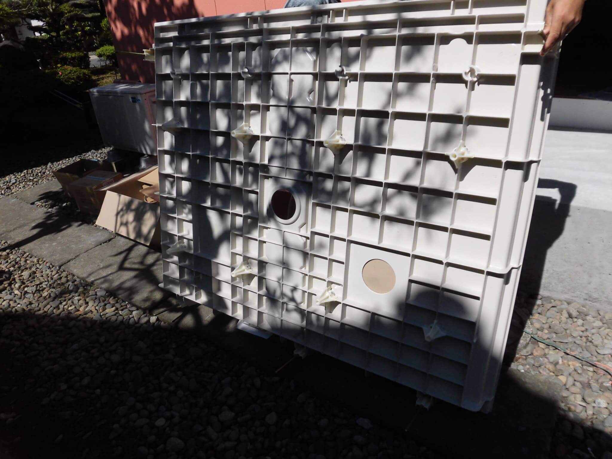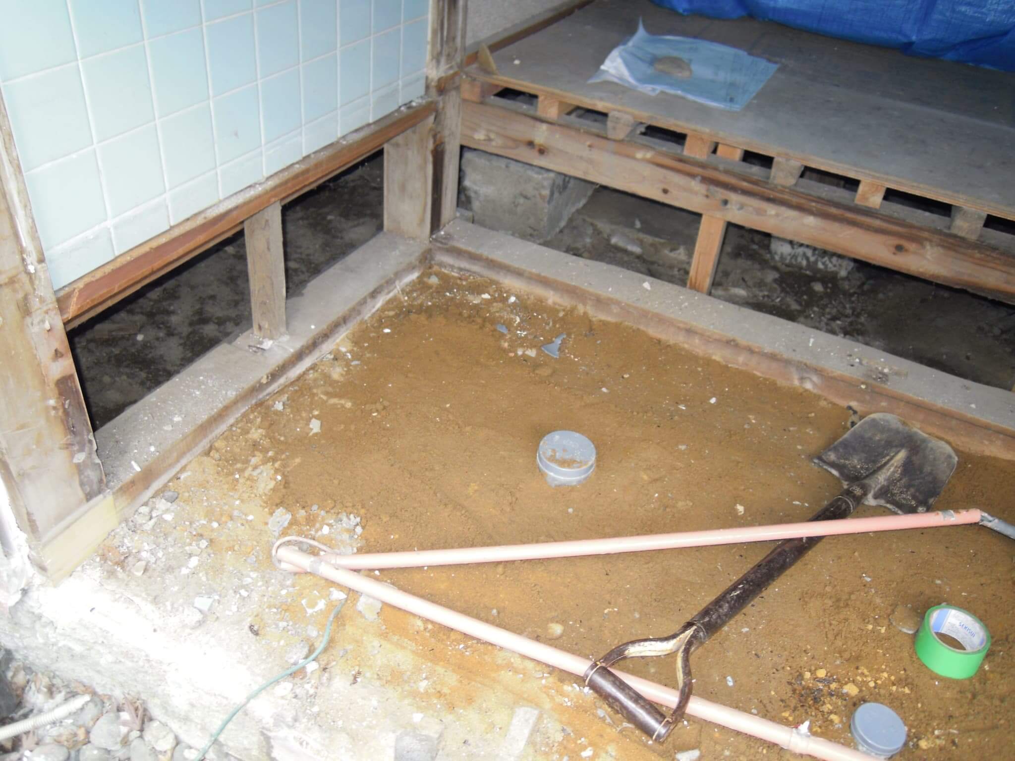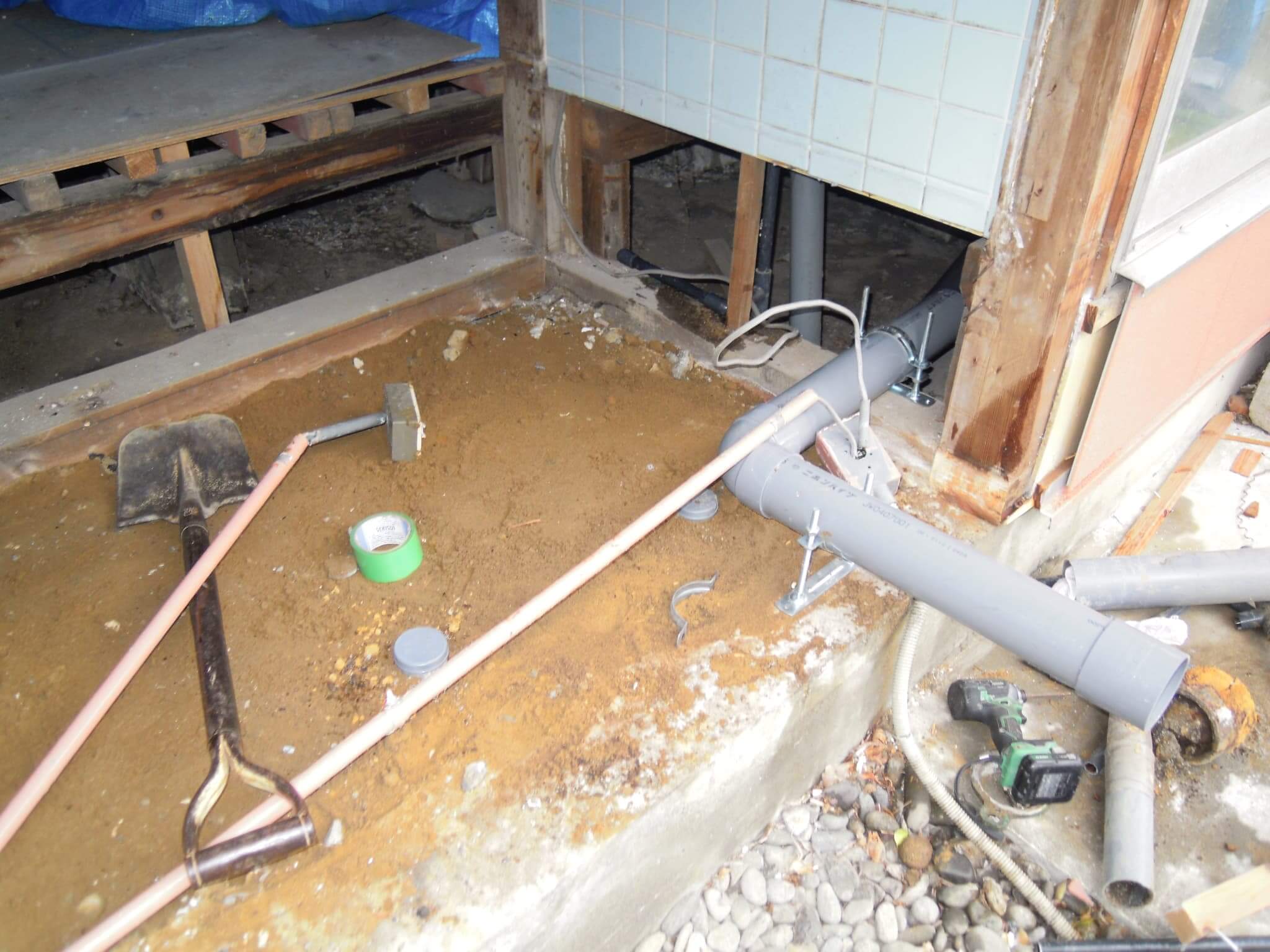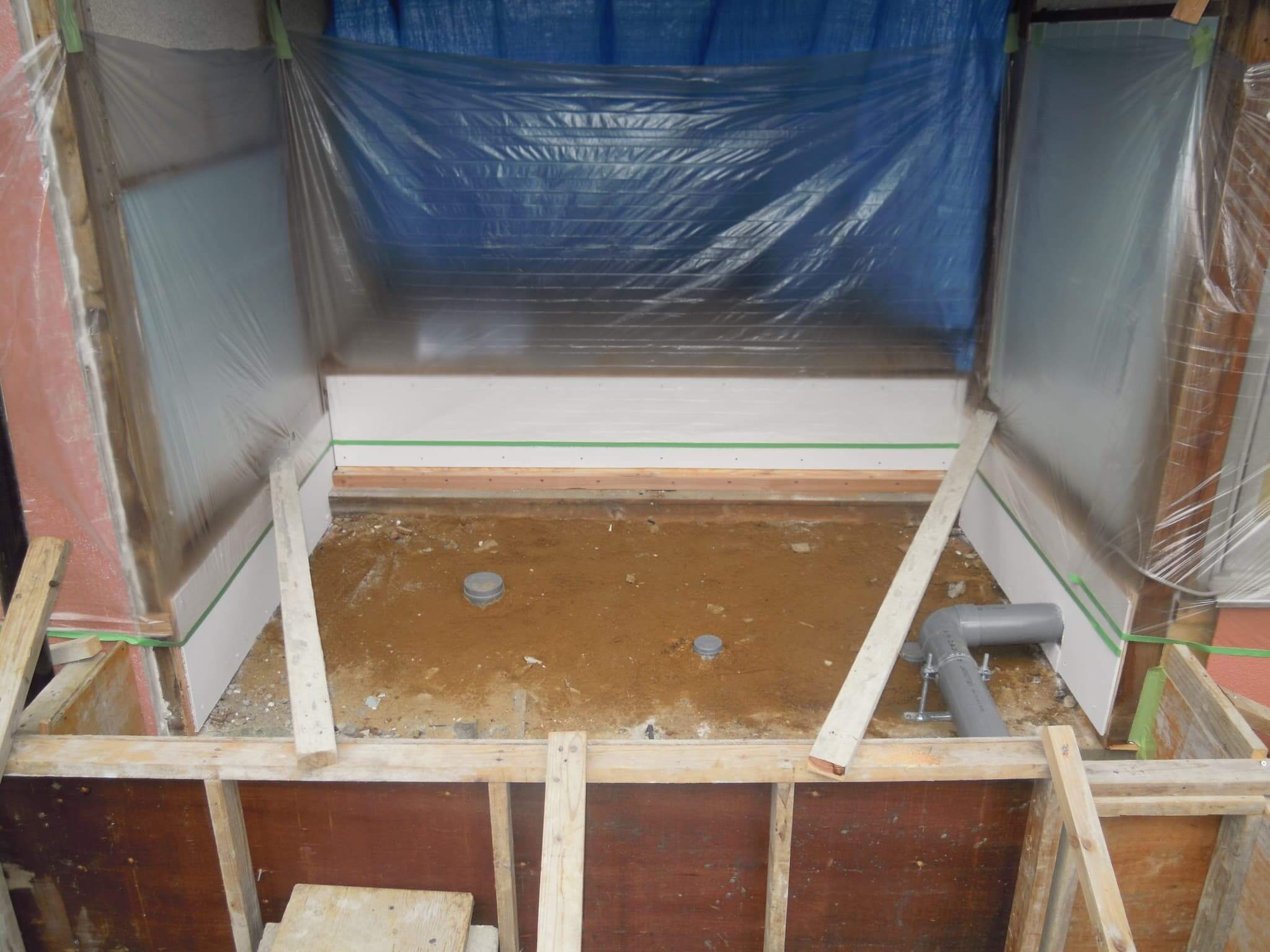 今回の工事では、洗濯機置き場の増設もご要望されましたので、その排水経路の増設と、これまでつかっていたトイレの排水を流用することなく、ユニットに対する排水を新設することにしました。これには理由があって、ユニット内ではトイレだけではなく、シャワーの運用もあることと、それに加えてシャワーによる室内清掃もあるということで「排水流量が多くなる」ことを見越しての措置です。