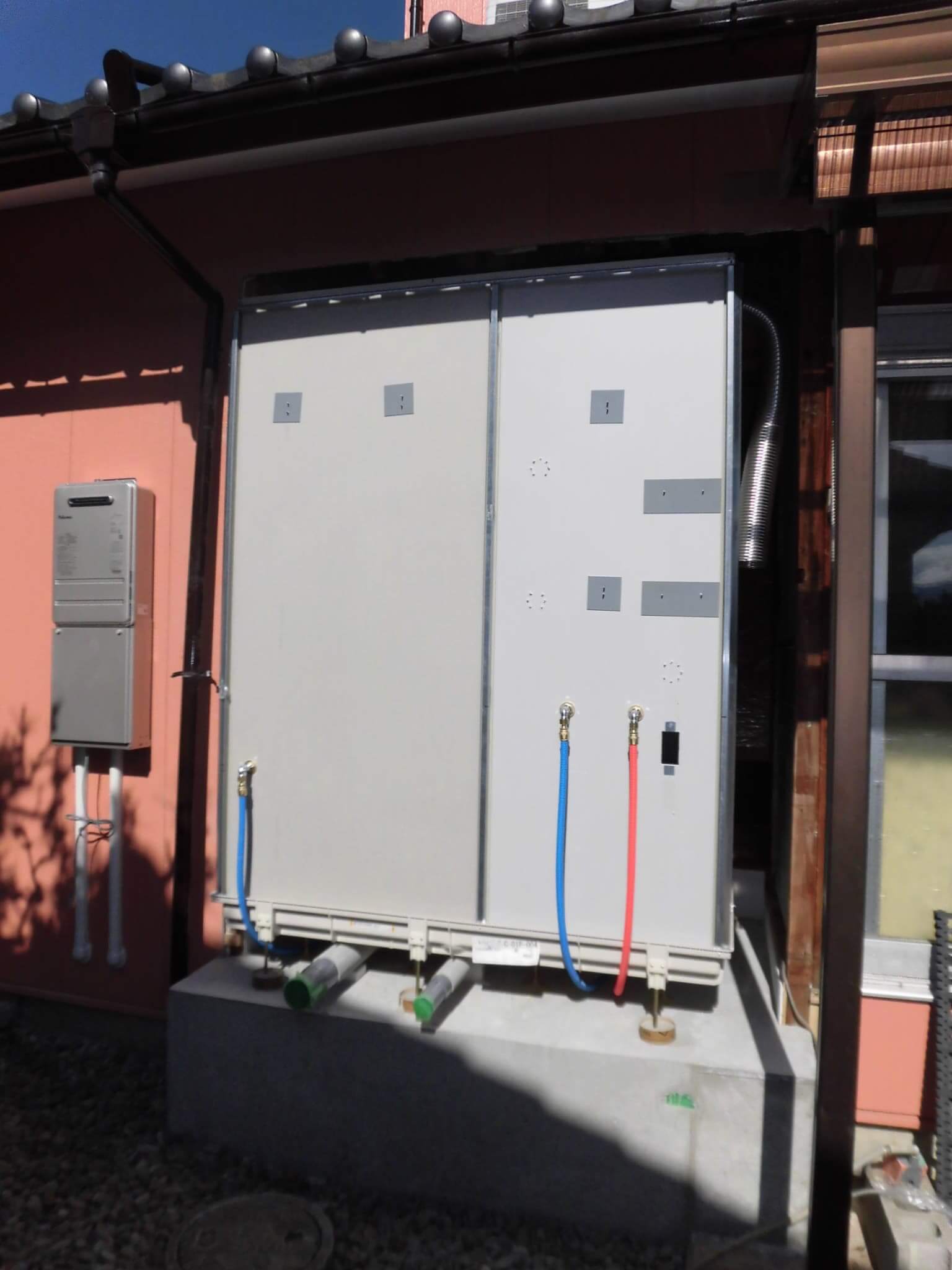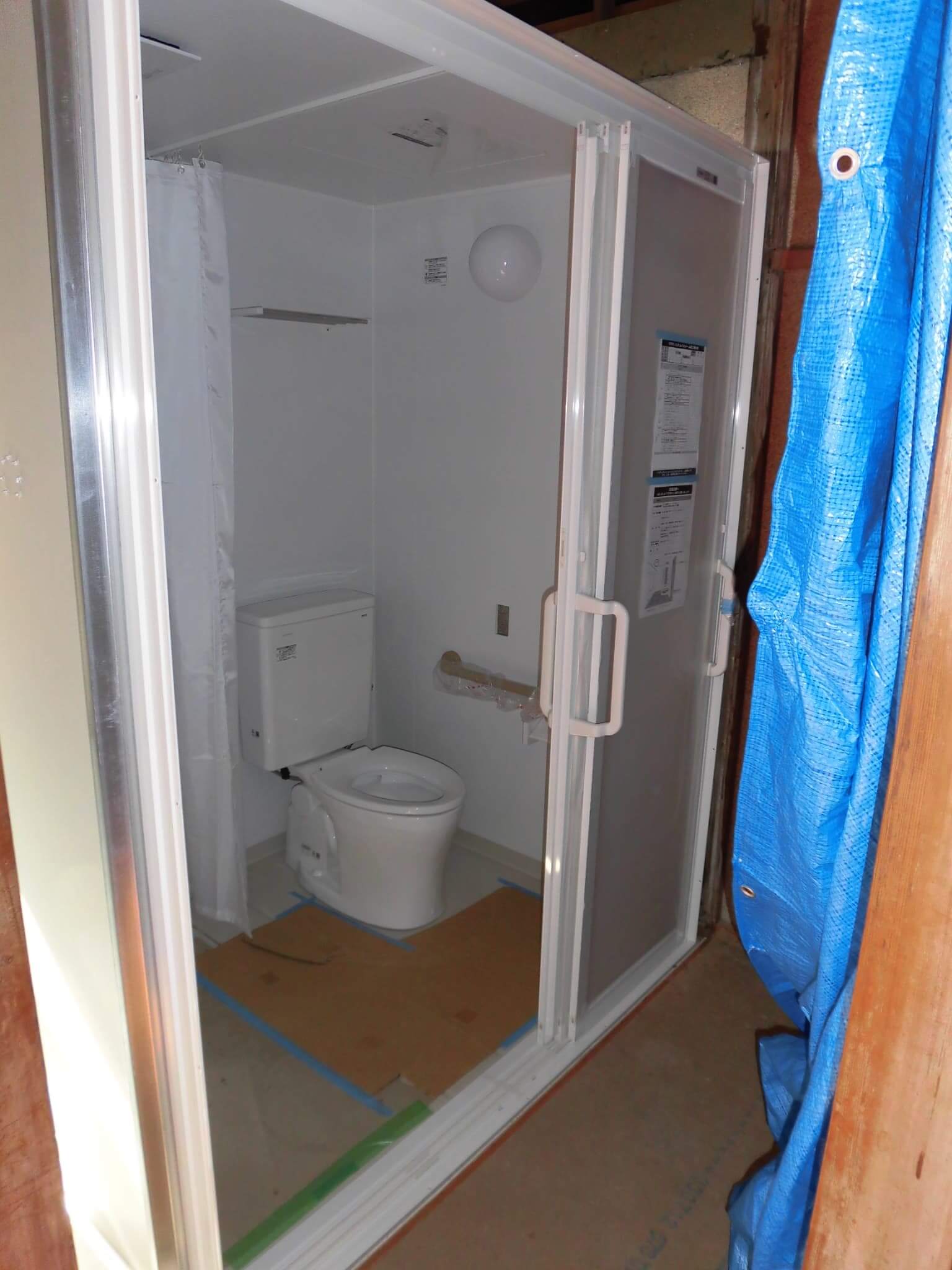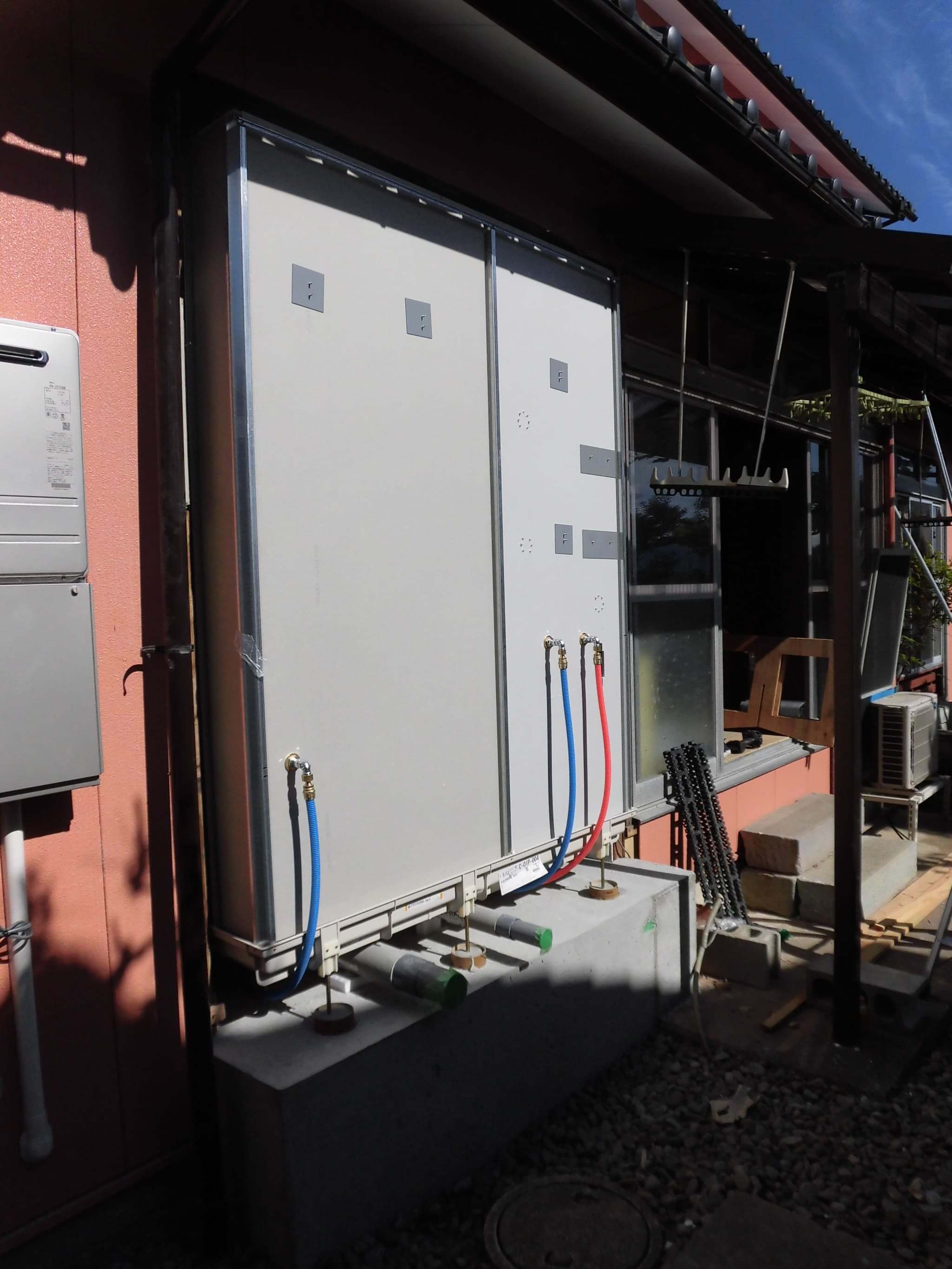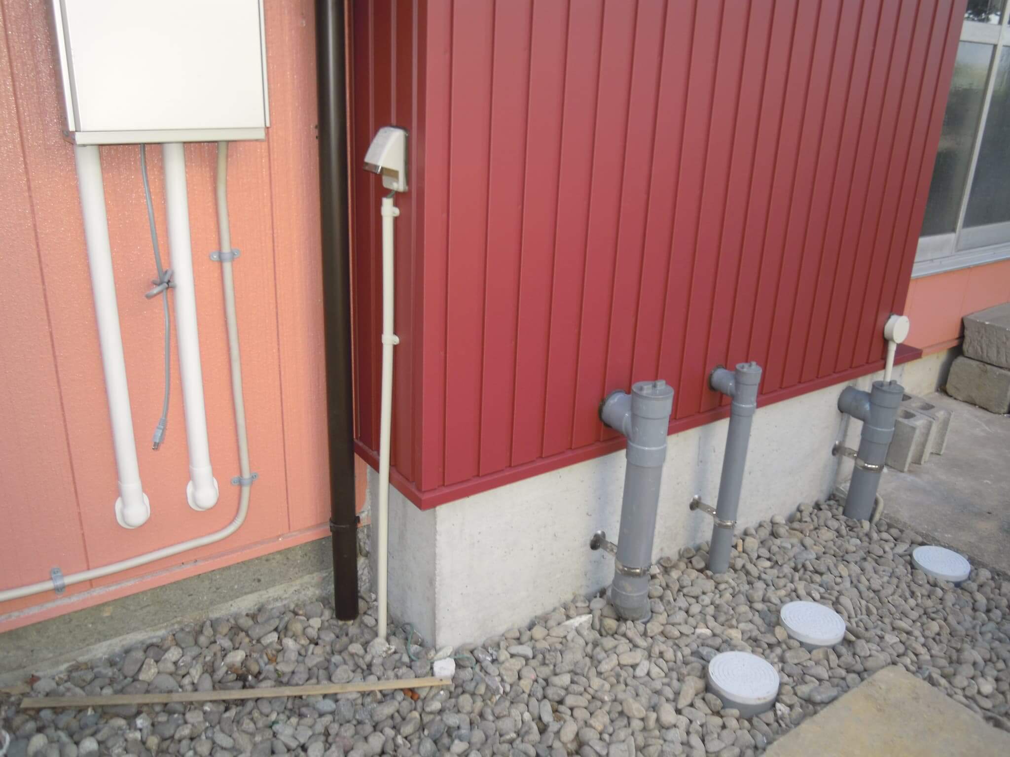 設置後の状況です。ユニットへの排水は土間コンクリート上で配管ルートをとっています。またこの排水管路は壁の中などに隠蔽することなく、すべて「露出」としております。これは、介護運用の際に排水管へのゴミなどの流入により詰まりを発生させてしまった場合に、最悪、配管の取替などでの対応がすぐにできるようにするという目論見があります。ユニットも設置できたので、あとはこれらを囲っていく内外装の仕上げ工事にはいっていきます。
