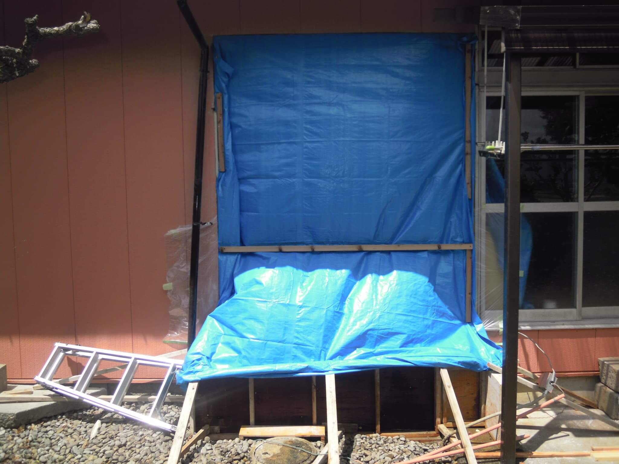 外部の囲いは、屋根の軒下までで納まるようにしておりますので、出っ張った部分に新たに屋根を作る必要ありません。単に壁を立てるだけでよいです。