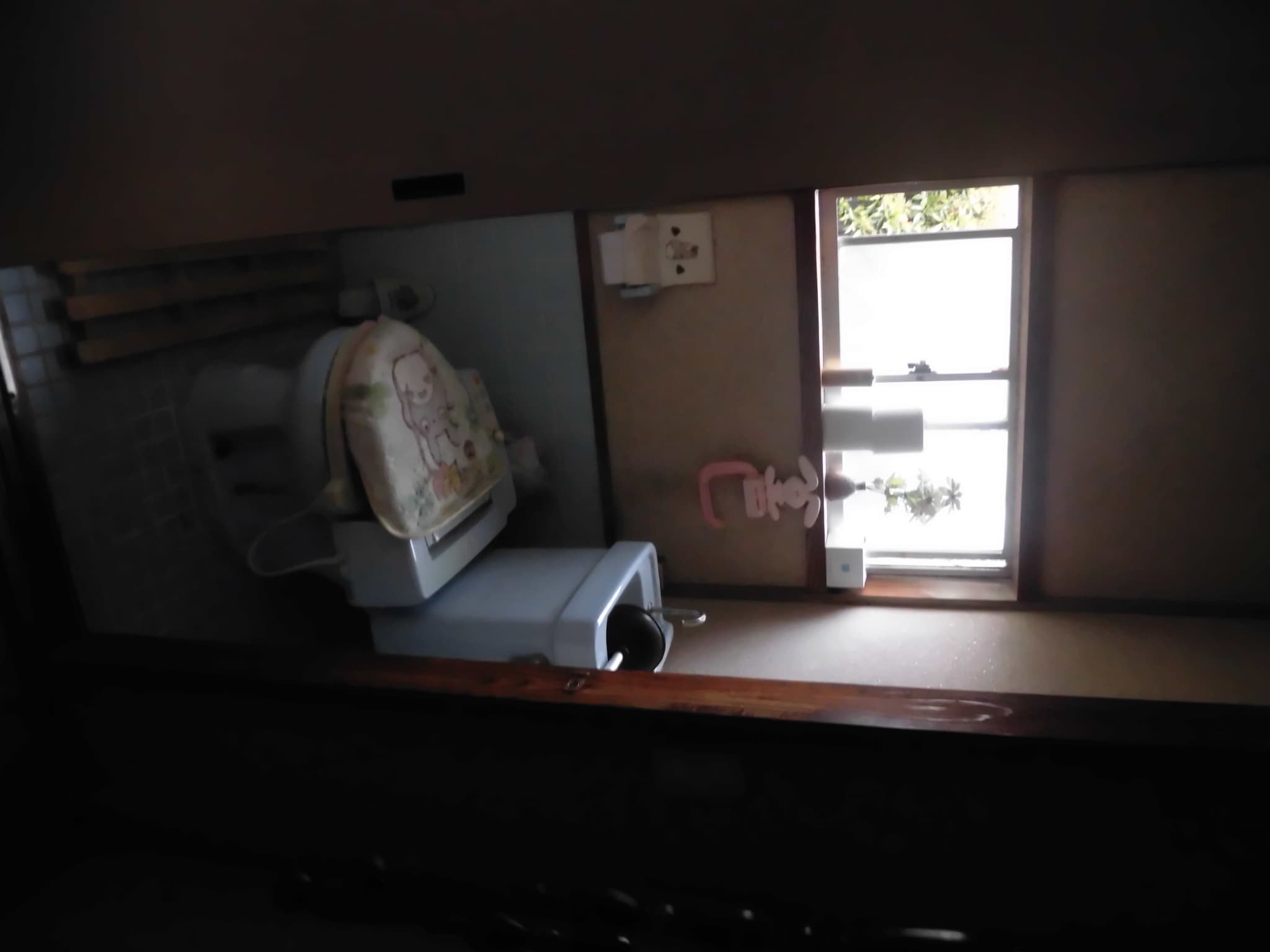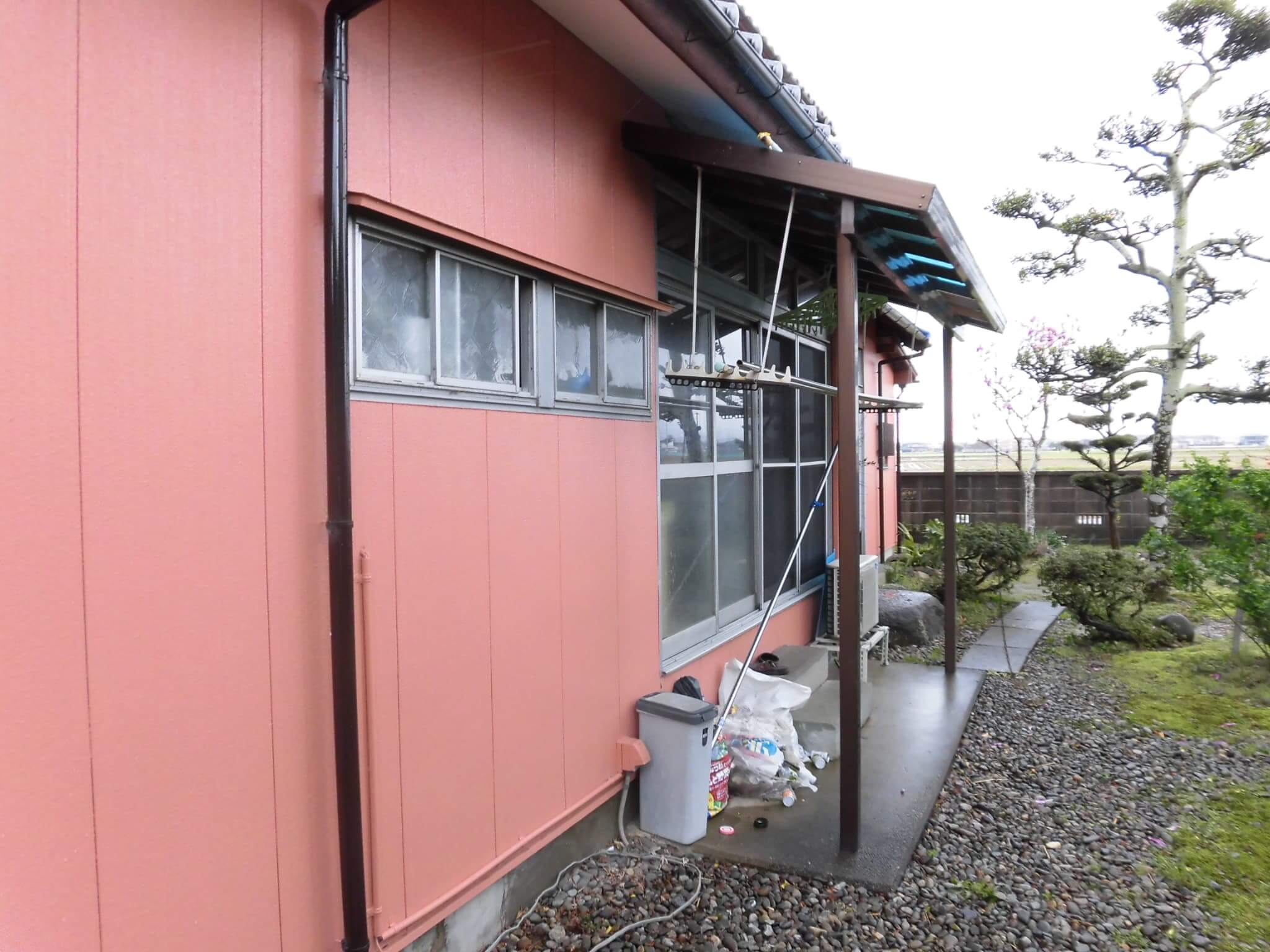 今回のトイレは幅方向には問題はないのですが、奥行き方向で少し外に追い出すことが必要でした。ところが、今回のトイレは外壁部分に窓が2つはいっており、耐力壁という状況ではないこともあって、この外壁部分を抜き、外に追い出すことで対応が可能でした(田舎で仏壇が大きい時に、仏壇の奥行き分、外に出すやり方と同じです)。できるだけコストを落とすために追い出す寸法は屋根の軒先が限界となります。