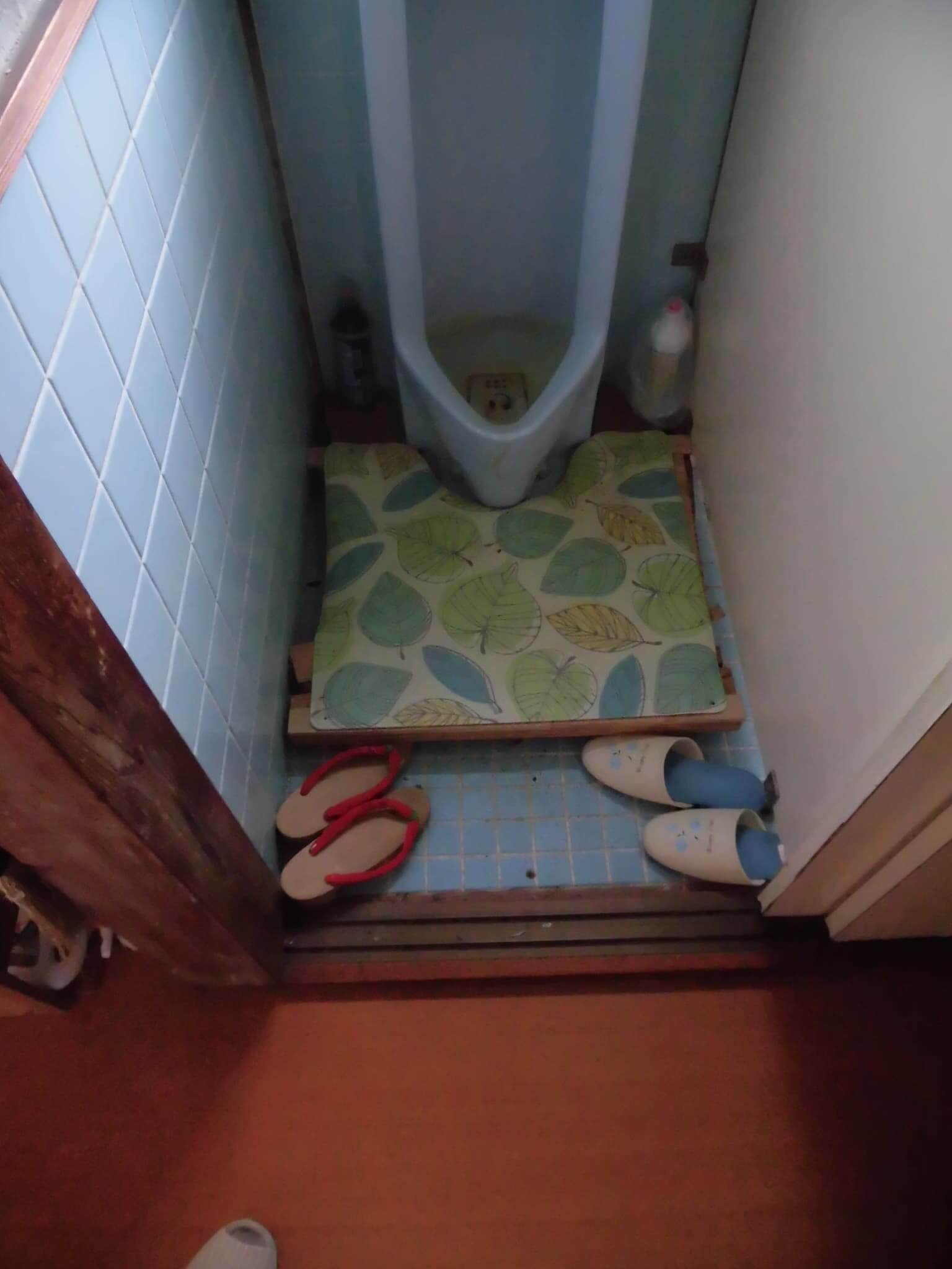 トイレスペースとしては、幅広なんで、小便器と洋式便器が置かれるくらいのスペースがあるわけですが、敷居があって、洋便器前のスペースは結構狭いので立上りなどの動作で少々不便です。また、最大に問題なのは、加齢により足元がおぼつかなかったり、排泄後の陰部のふき取りなどがあまりうまくできなくなってきており、結果として便が床にこぼれる状態になっています。当然、清掃はしますが、床タイル面に水を撒くなどの清掃はそれほど頻繁にできないということで、かなりトイレ内に匂いが立ち込める状況でもあり、清潔感もなくなっています。これらのことを危惧され、なにか良い方法がないものか?とのご相談でした。