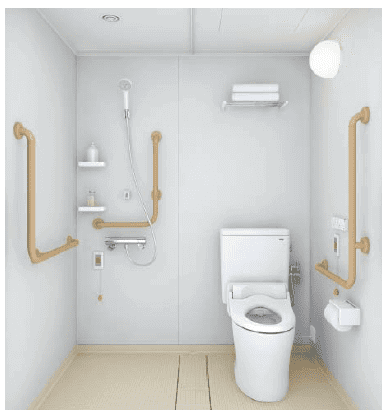 これらをきっちり要望として叶えるための介護改修です。単にトイレスペースを広くするとか、段差を解消するなどの一般的に「バリアフリー」とか「高齢者対応」というレベルでの改修計画では叶えることができません。そこで、専門的な高齢者施設や介護施設で使われている「トイレ・シャワーユニット」を採用することにしました。以下の画像がそれです。