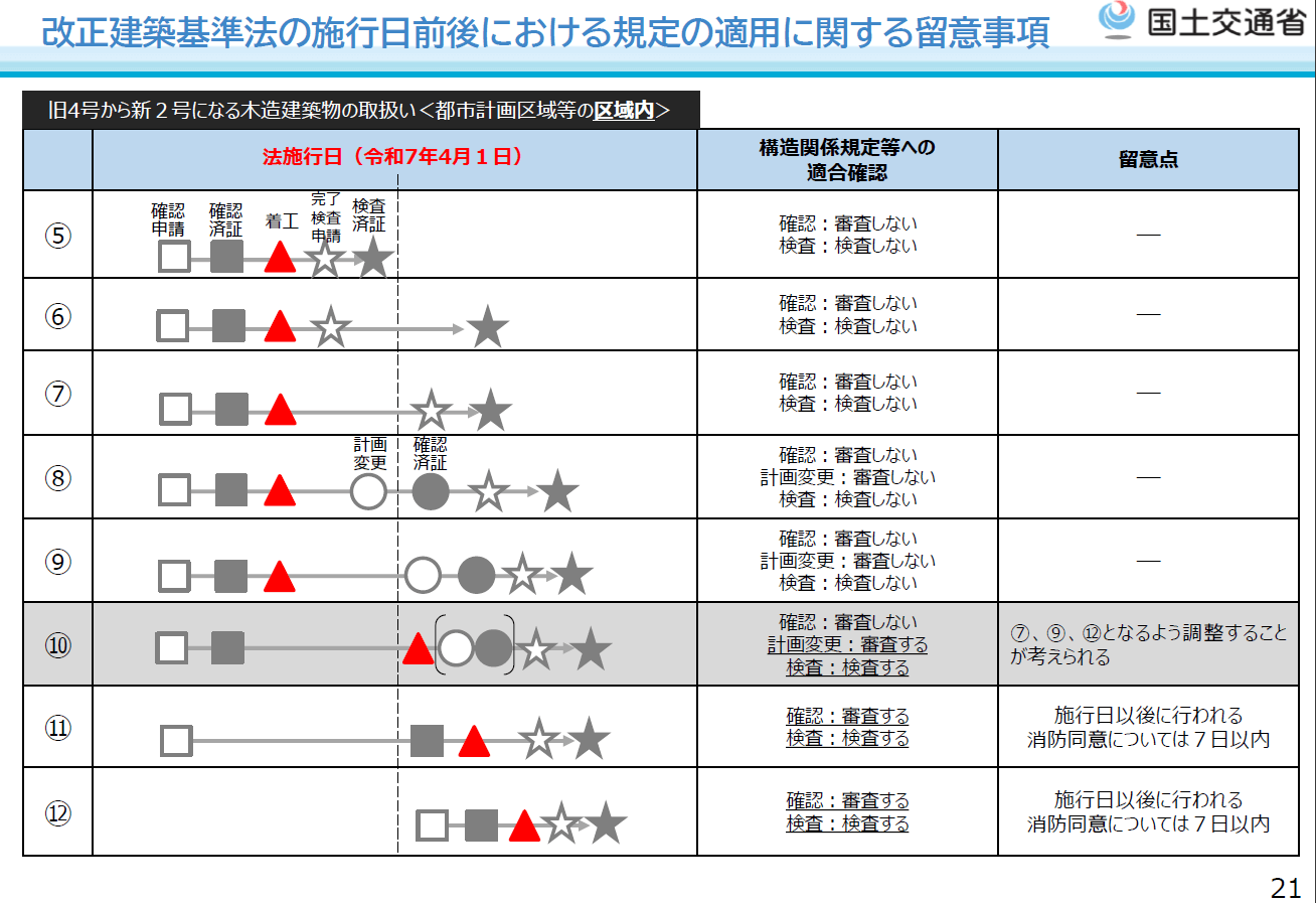 また、確認申請の時期、済証発行の時期、工事着工時期、完了検査時期による扱いの違いも資料として公開していますが、これは経過措置を使う使わないに限らず、法施行日以前に済証発行、着工しているものについての扱いの違いで、特に「計画変更」の部分の扱いが重要になっています。