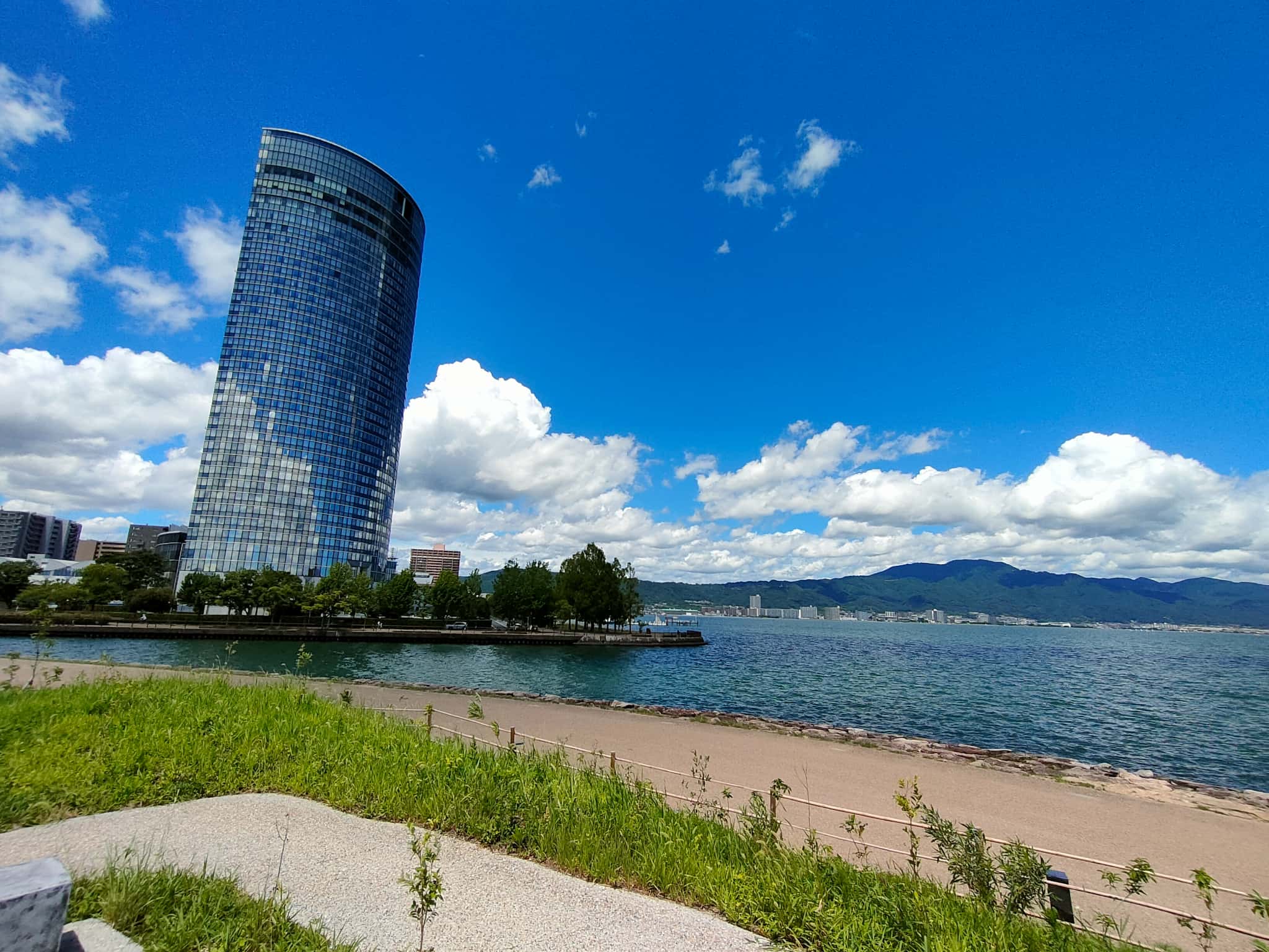 琵琶湖の青と、緑の庭園のコントラストがすごくきれいです。