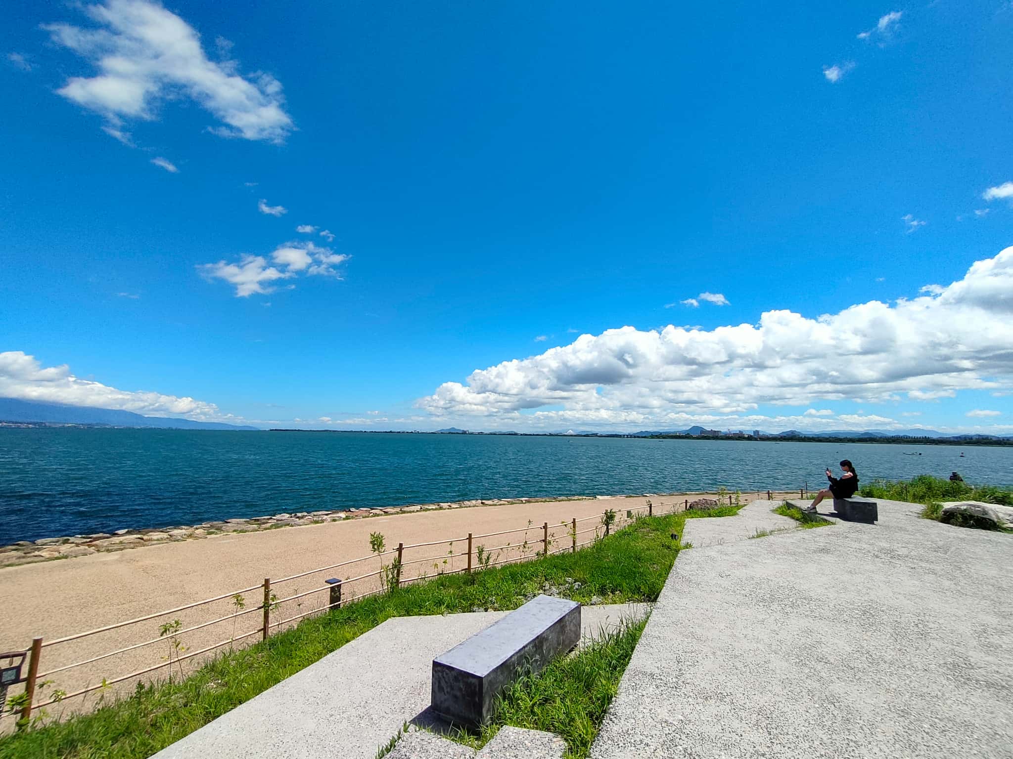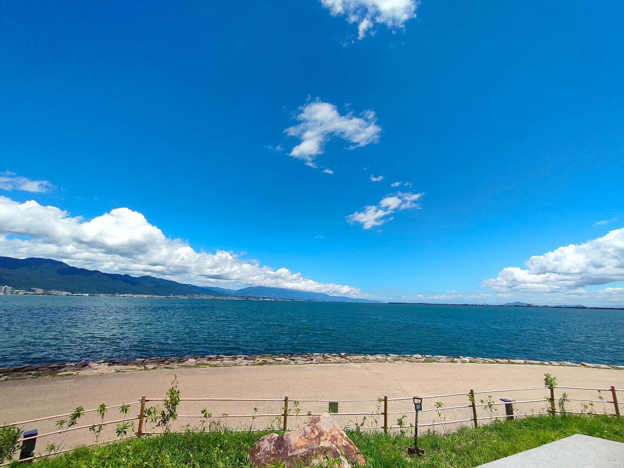 暑さ真っ只中だったのですが、ちょっとした仕掛けも作られていて、木陰のベンチが作られているのですが、影になる部分が絶妙な面積でそこから琵琶湖を一望できるような配置にもなっています。