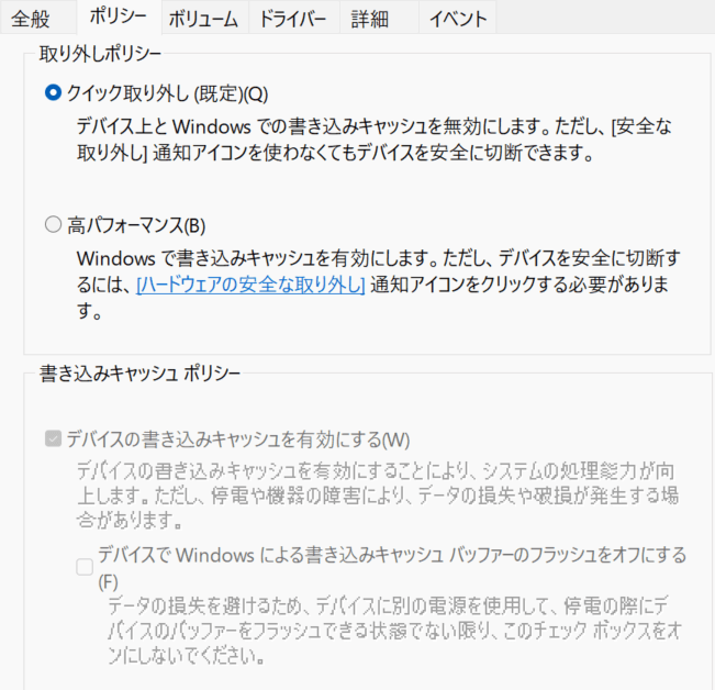 ディスクドライブに対するハード的なポリシーは、そのストレージの形態によって原則デフォルトの設定が自動的になされます。例えば、USB接続による外付けドライブなどですと、