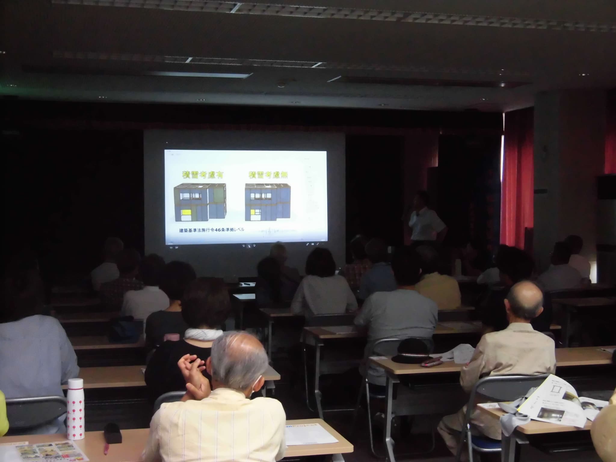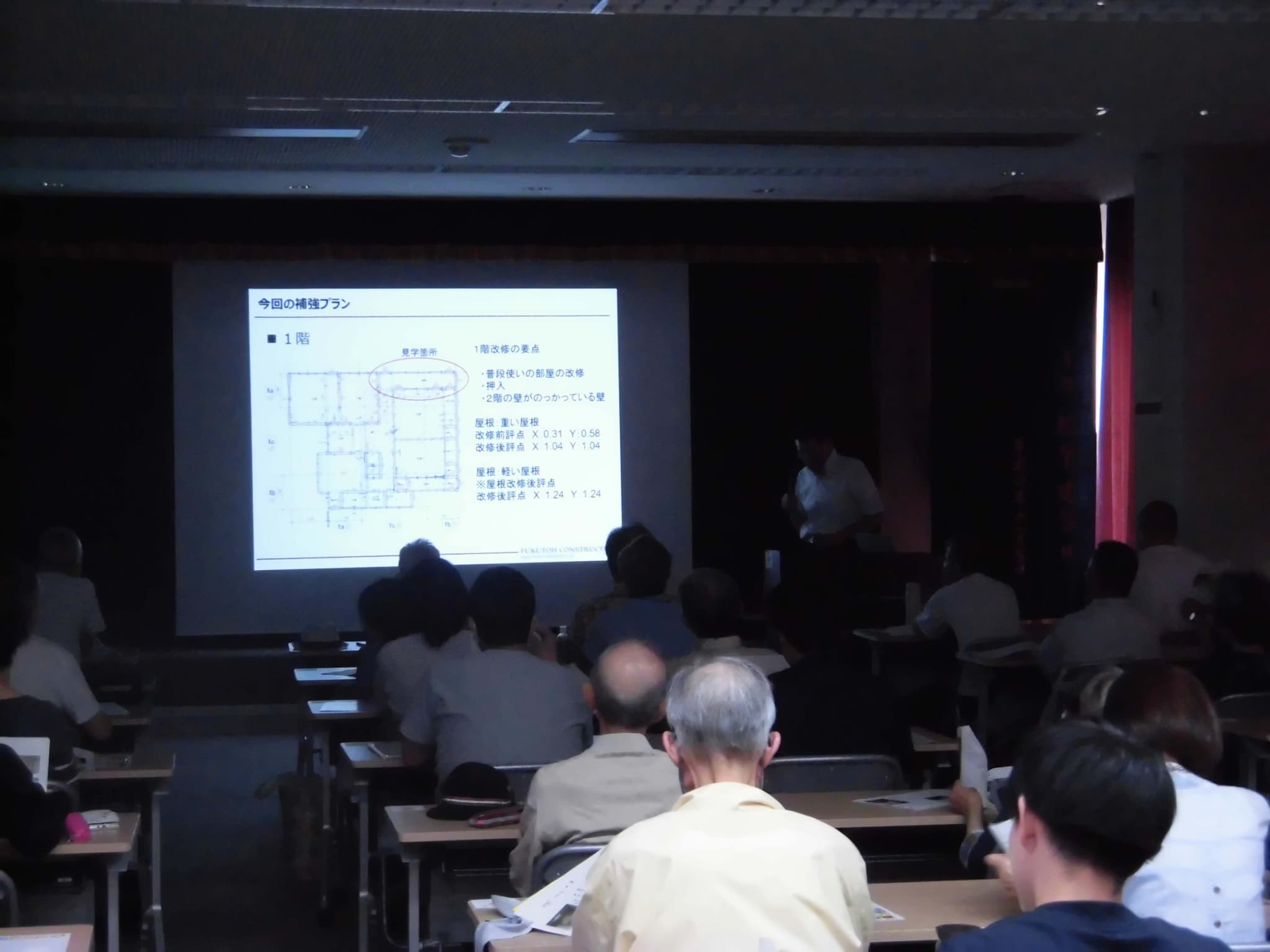 見学会に先立ち、福井市森田公民館にて座学として説明会が開催されました。会場には30名以上の、旧耐震基準での木造住宅を所有されている方、また、設計士さんなど業務に携わっておられる方数名もご参加くださいました。