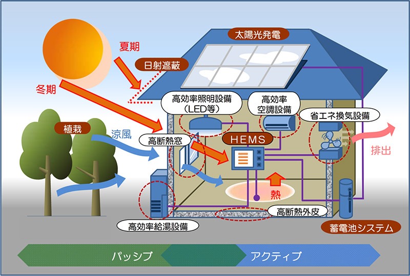 「外皮の断熱性能等を大幅に向上させるとともに、高効率な設備システムの導入により、室内環境の質を維持しつつ大幅な省エネルギーを実現した上で、再生可能エネルギーを導入することにより、年間の一次エネルギー消費量の収支がゼロとすることを目指した住宅」