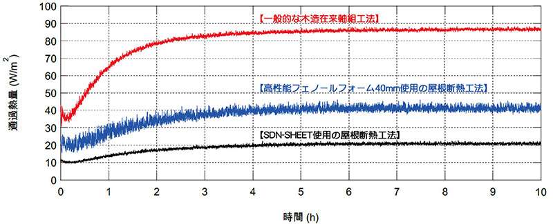 外皮性能をアップするための方法として、様々な断熱材を使った断熱性能の向上があります。国内外の各社から様々な断熱素材を使った断熱材が出ています。机上の計算ではこれらの高性能断熱素材を使用することで外皮性能を上げることが可能です。しかし、断熱性能の高い断熱材が必ずしも快適な住環境を実現できるわけでは有りません。当社では、断熱だけではなく遮熱という熱の伝達を遮断する方法にも注目して、当社オリジナルの遮断熱素材であるSDN-SHEETを開発しました。SDN-SHEETは高純度のアルミニュウム泊を使用した熱線高反射素材です。外皮の中に使用することで、断熱材の熱の蓄熱・放熱を補助し高い省エネ効果を発揮する素材です。